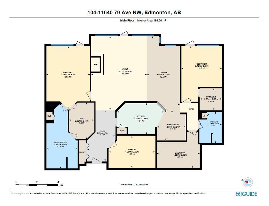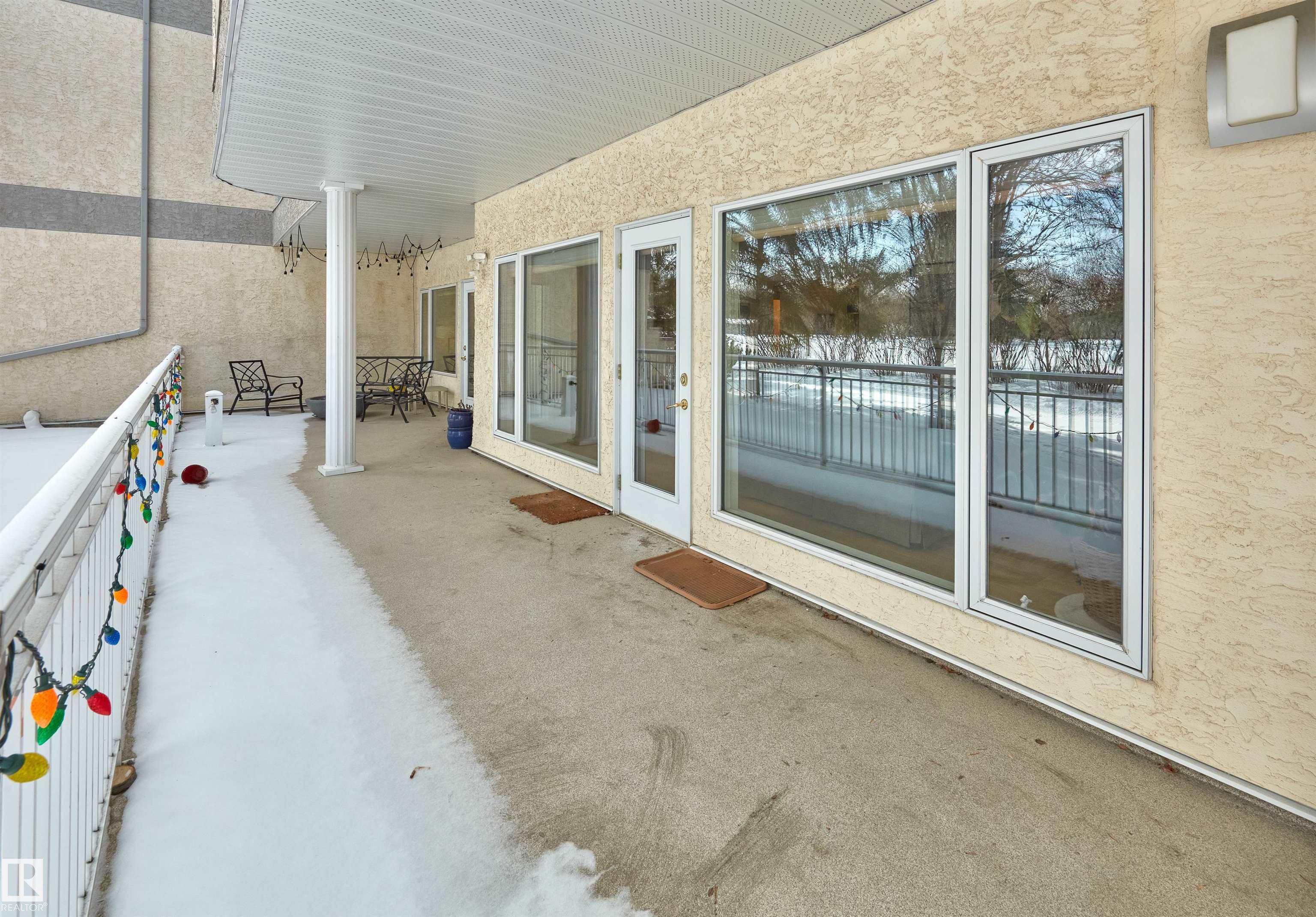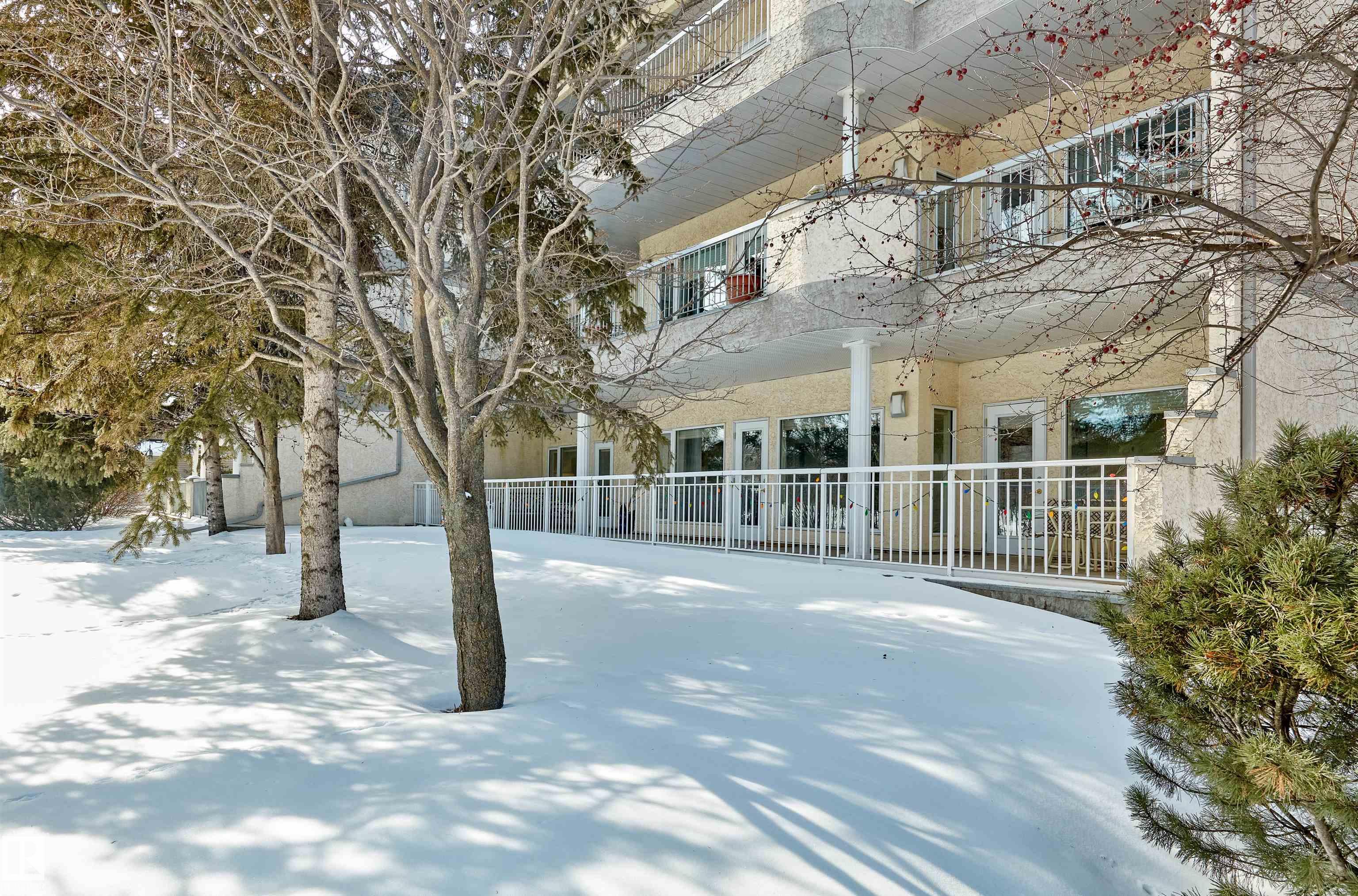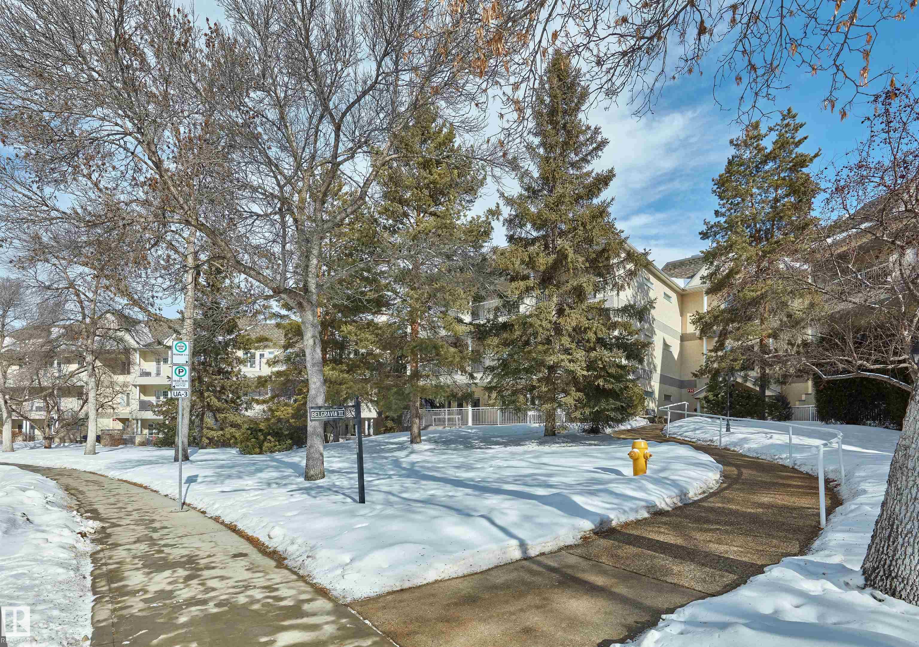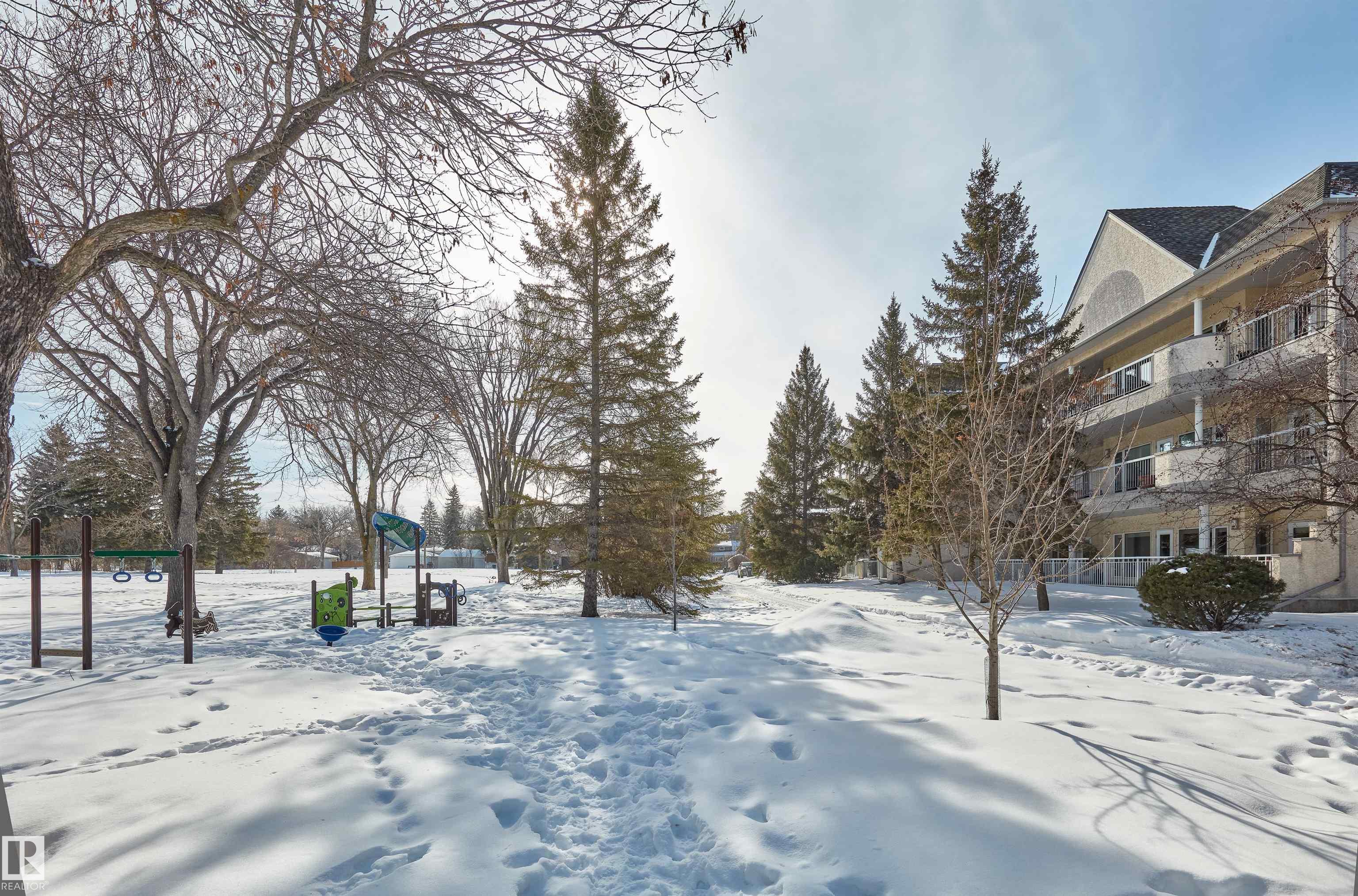 Welcome to this spacious 1,990 sq ft main-floor residence in Belgravia III, a well-managed complex in an exceptional location just steps from the University of Alberta, major hospitals, the Jubilee Auditorium, and the beautiful River Valley. Designed for comfortable living and effortless entertaining, the expansive layout features oversized living and dining areas, two generous bedrooms including a primary suite with a luxurious 5-piece ensuite, a versatile main-floor den/office, and a large kitchen with abundant cabinetry and breakfast nook. Quality finishes include engineered hardwood floors, a gas fireplace with mantel, 9-foot ceilings, triple-pane windows, in-suite laundry and storage, and air conditioning. Step outside to a huge east-facing patio overlooking a private park-like setting--perfect for morning coffee or quiet relaxation. This exceptional home also includes two heated underground parking stalls, a large storage locker, a fitness room, and a car wash.