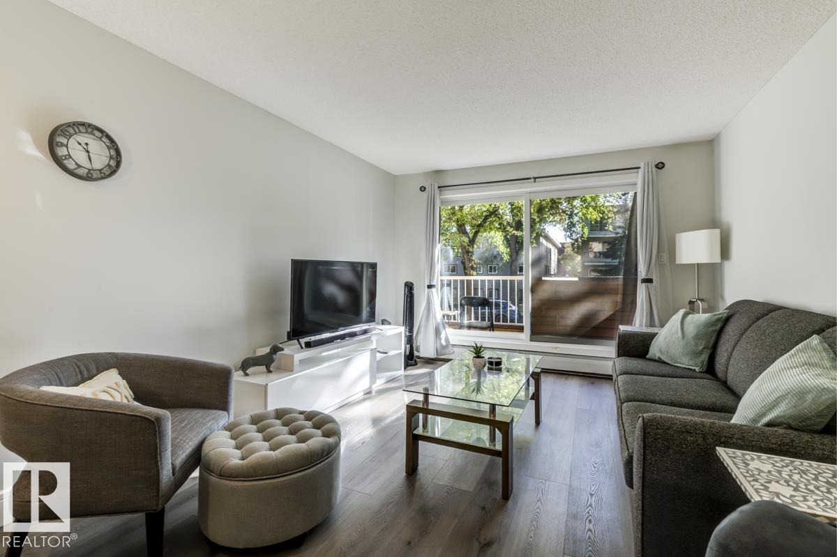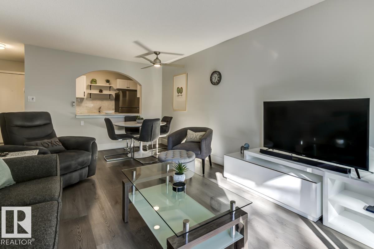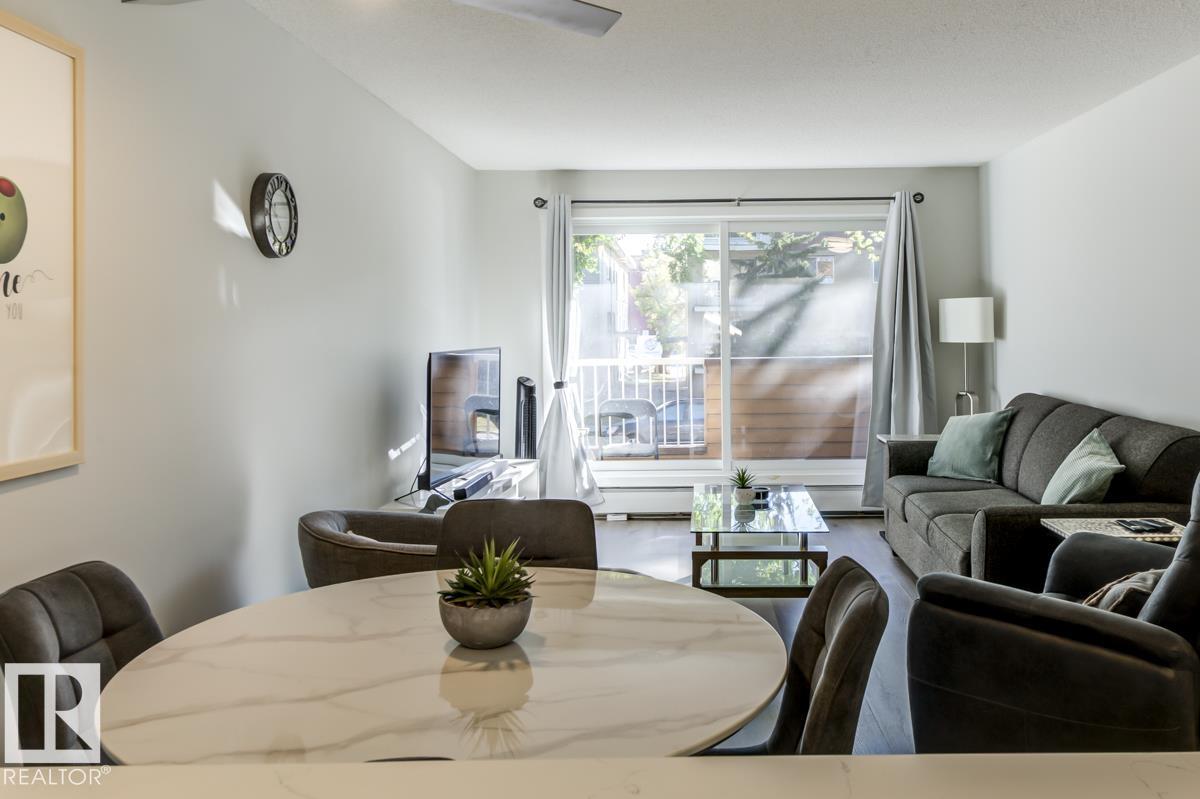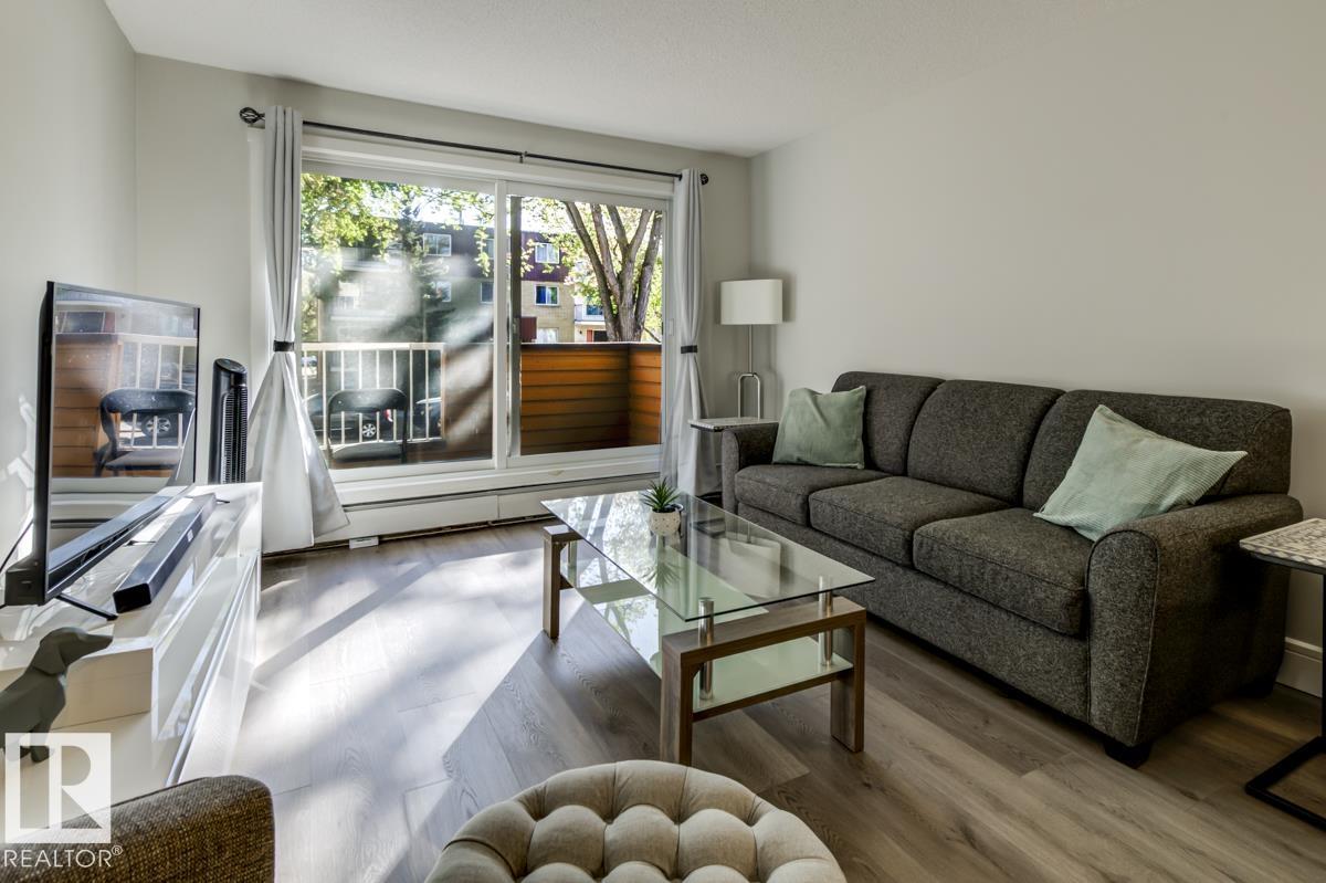 Attn Edmonton, First time buyers, Investors, Students and Sports Fans. Step into this beautifully renovated 2nd floor 1 bedroom, 1 bath condo! This unit is just steps from Rogers Place arena, MacEwan University, the LRT, and all the excitement of the Ice District. Inside, you'll love the bright, open layout featuring Vinyl Plank flooring throughout, crisp white cabinets, sleek stone countertops, and stainless steel appliances. A generously sized bedroom and updated bathroom provide comfort and convenience, while ample in-suite storage space keeps everything organized. The private balcony is ideal for morning coffee or unwinding after the big game. Whether you're catching an Oilers game, a concert, heading to class, or enjoying Edmonton's vibrant dining and nightlife scene, you'll be perfectly situated to take advantage of it all.