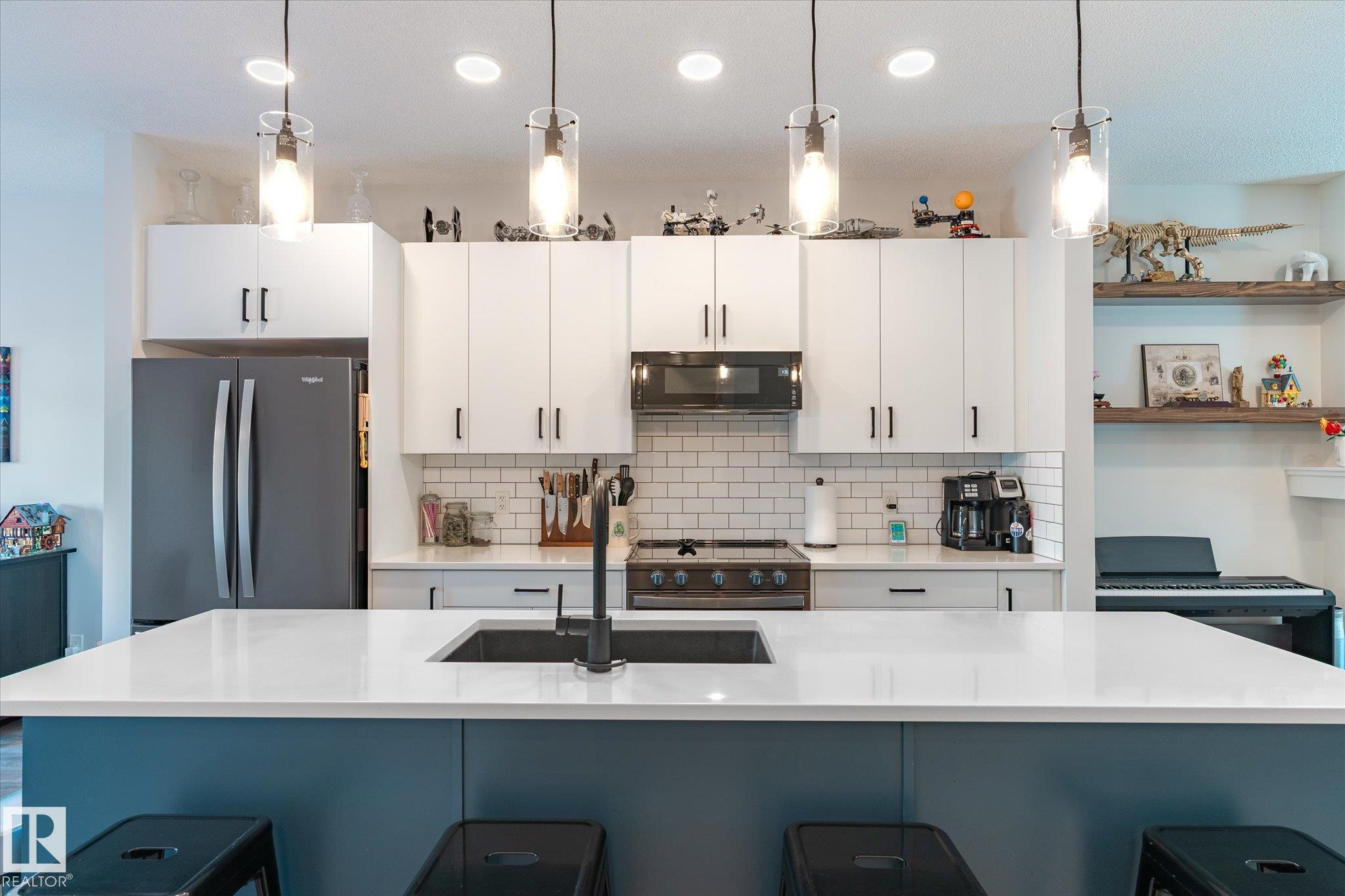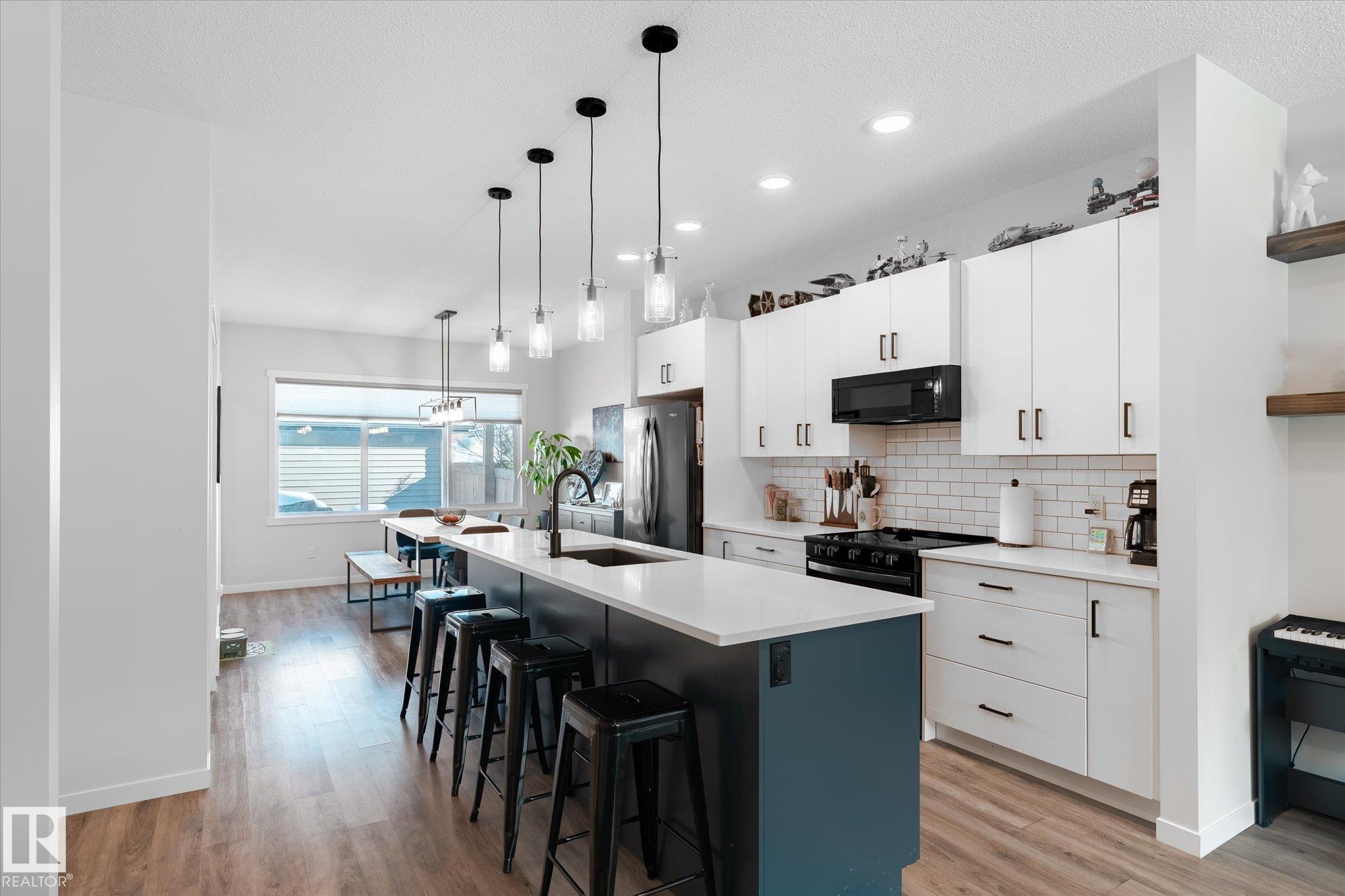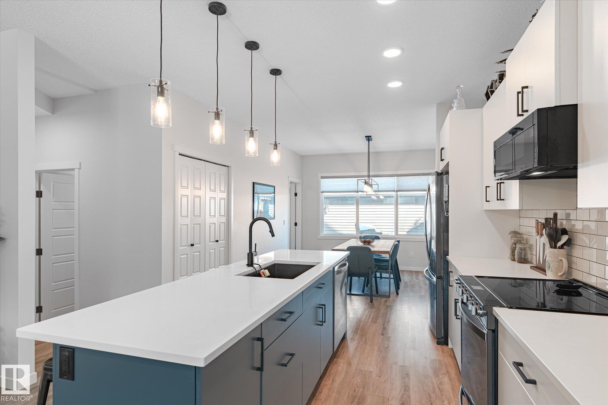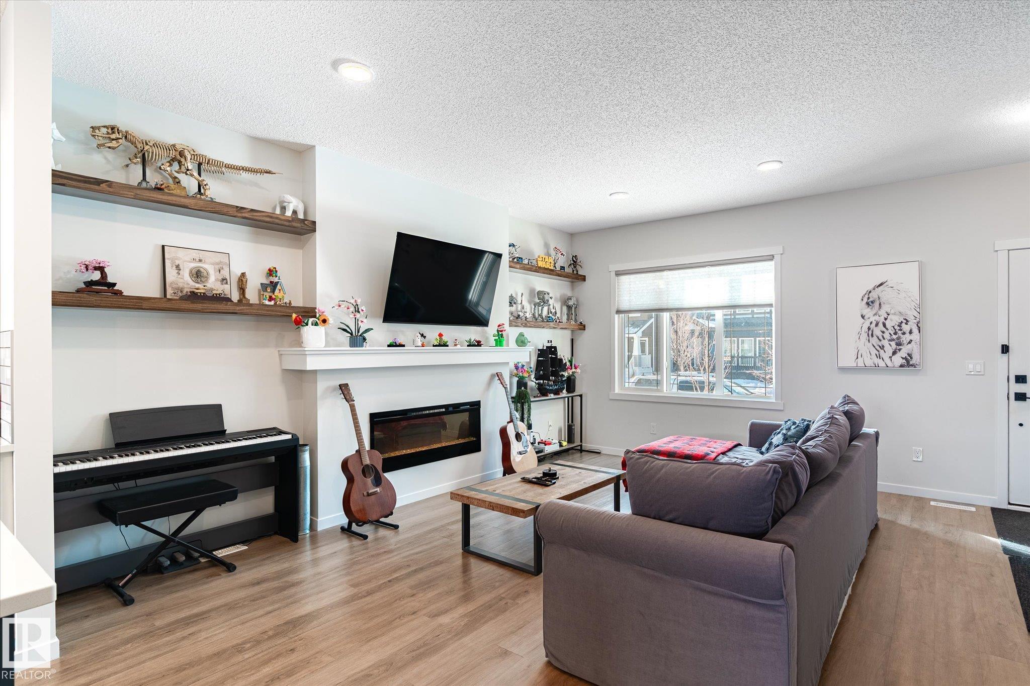 Welcome to this beautifully upgraded home in Crystallina Nera West! With 1693 sqft of modern living space, this home features an open-concept main floor with stylish vinyl plank flooring & A/C! As you enter, you're greeted by a nicely sized living room with custom shelving and an electric fireplace, creating a cozy and inviting atmosphere. The spacious kitchen boasts a large quartz island and quartz countertops throughout, complemented by an upgraded farm sink. The main floor also offers a chic 2-piece bathroom and a convenient laundry area. Upstairs, you'll find a large family room and three bedrooms, including a master suite with a generous walk-in closet and a 4-piece ensuite. All closets are California Closets, maximizing storage. A 4-piece bathroom completes the top floor, also featuring tile. The extended double detached garage (22x20) with a sub panel provides ample space. The fully landscaped backyard includes a deck perfect for relaxation. Located close to shopping & future school minutes away.