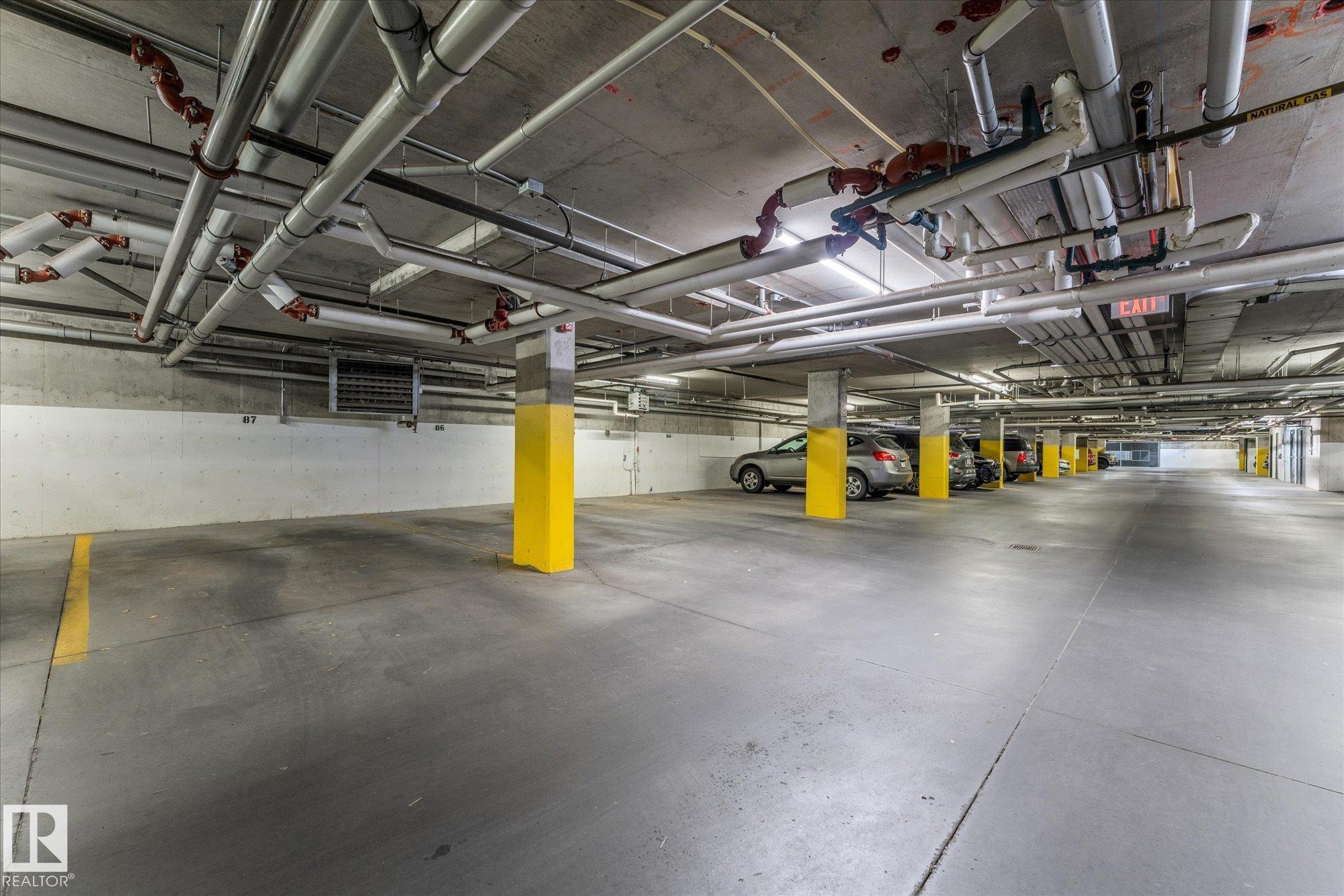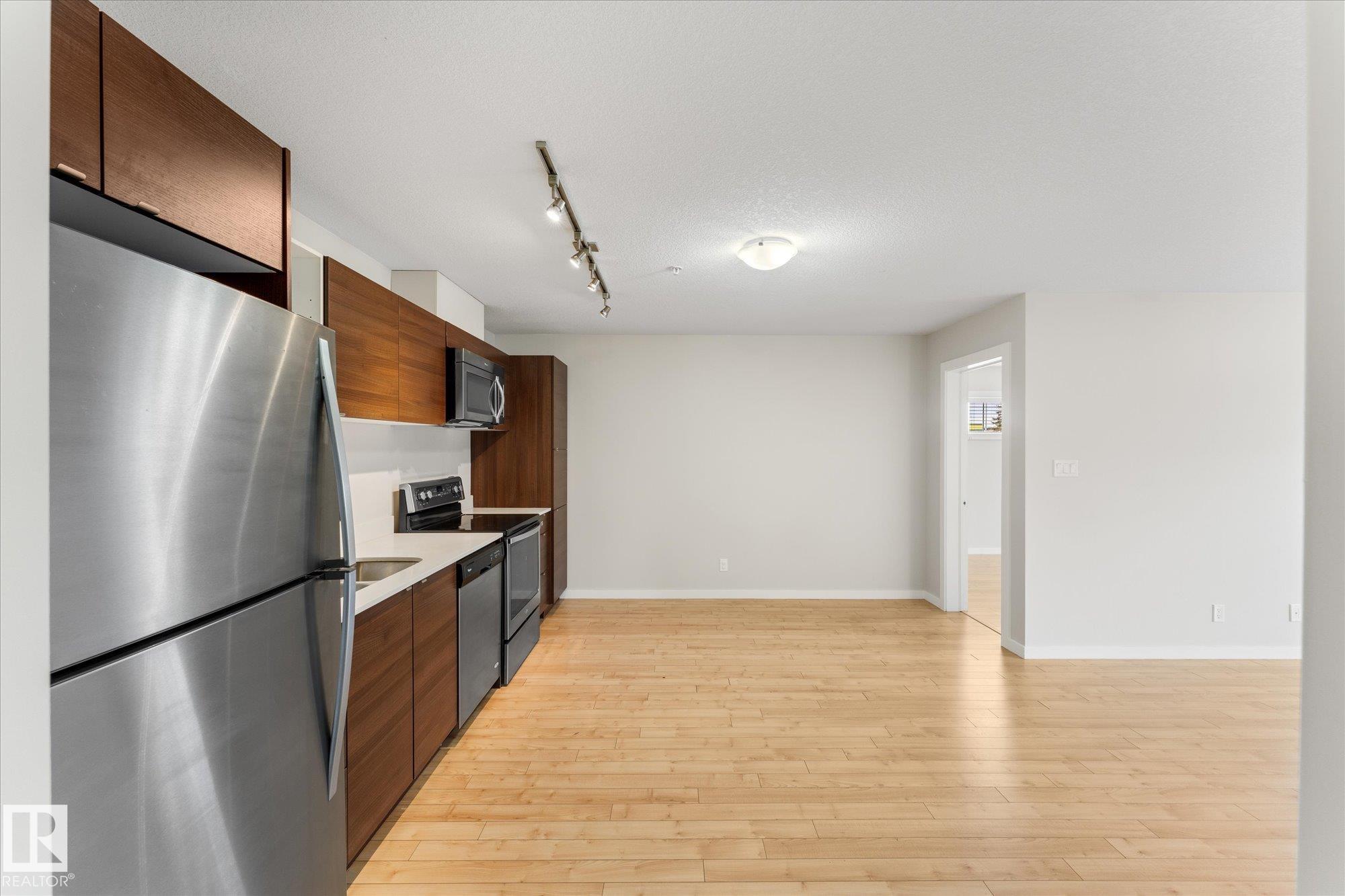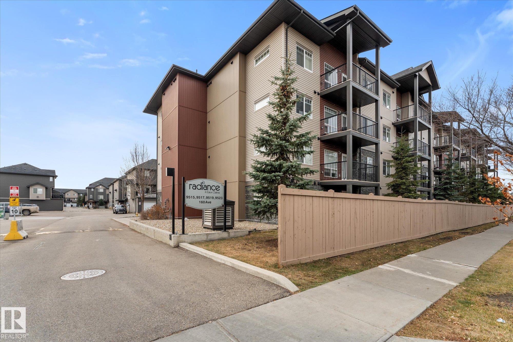 Welcome to Radiance in North Edmonton's desirable Eaux Claires community! This 2-bed, 2-bath END UNIT features modern cabinetry, quartz countertops, stainless steel appliances, fresh paint, and laminate flooring throughout with tile in the bathrooms. Enjoy TITLED HEATED UNDERGROUND PARKING (stall #87 near entry) and a private patio with natural gas BBQ hookup. The building offers elevator access and secure key-fob entry. Pets allowed (two max, dogs up to 17" shoulder). Steps from Save-On-Foods, Shoppers, restaurants, and Eaux Claires Transit Centre, with quick access to 97 St, Anthony Henday, Yellowhead, and Downtown. Perfect for owners or investors seeking location, lifestyle, and value!