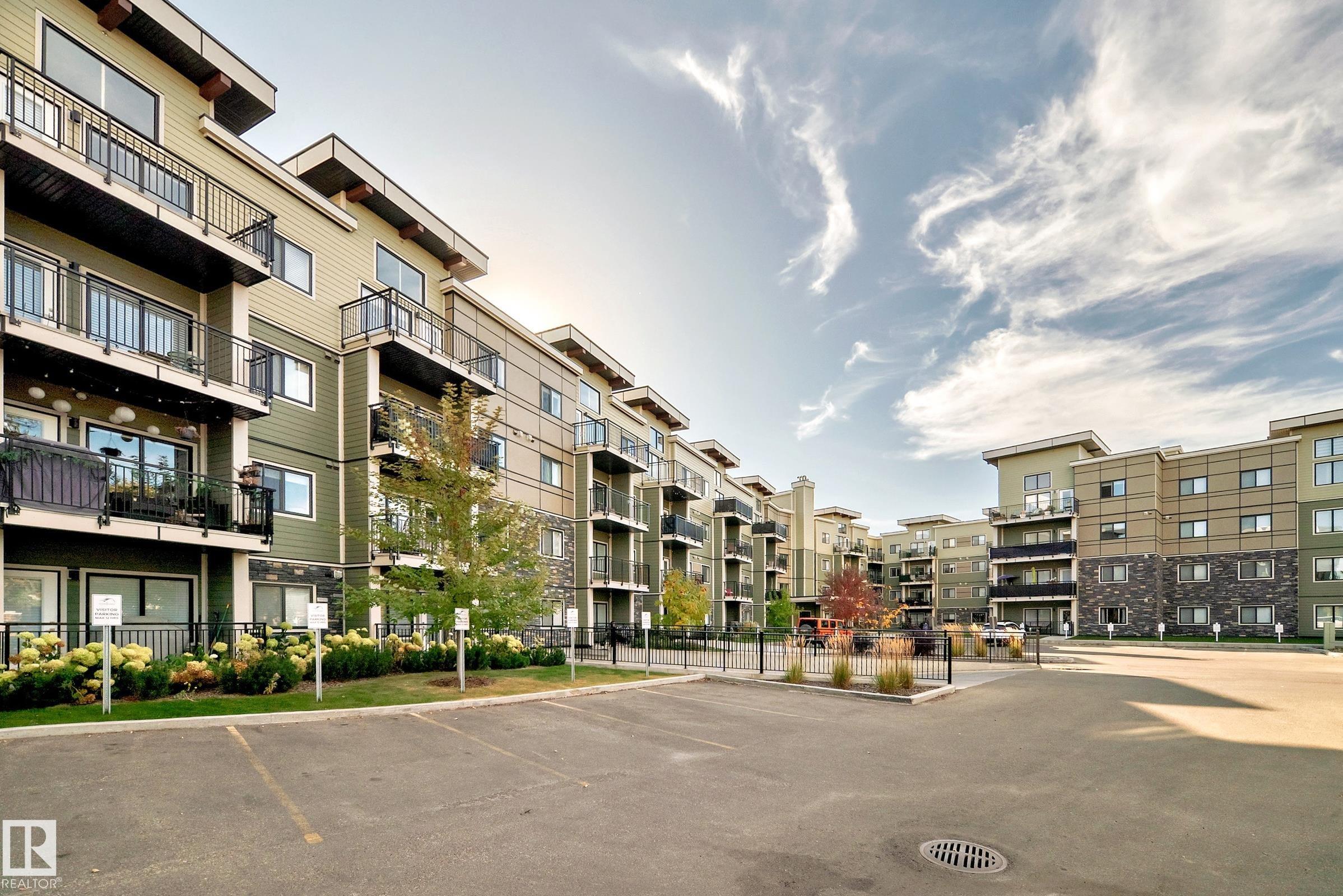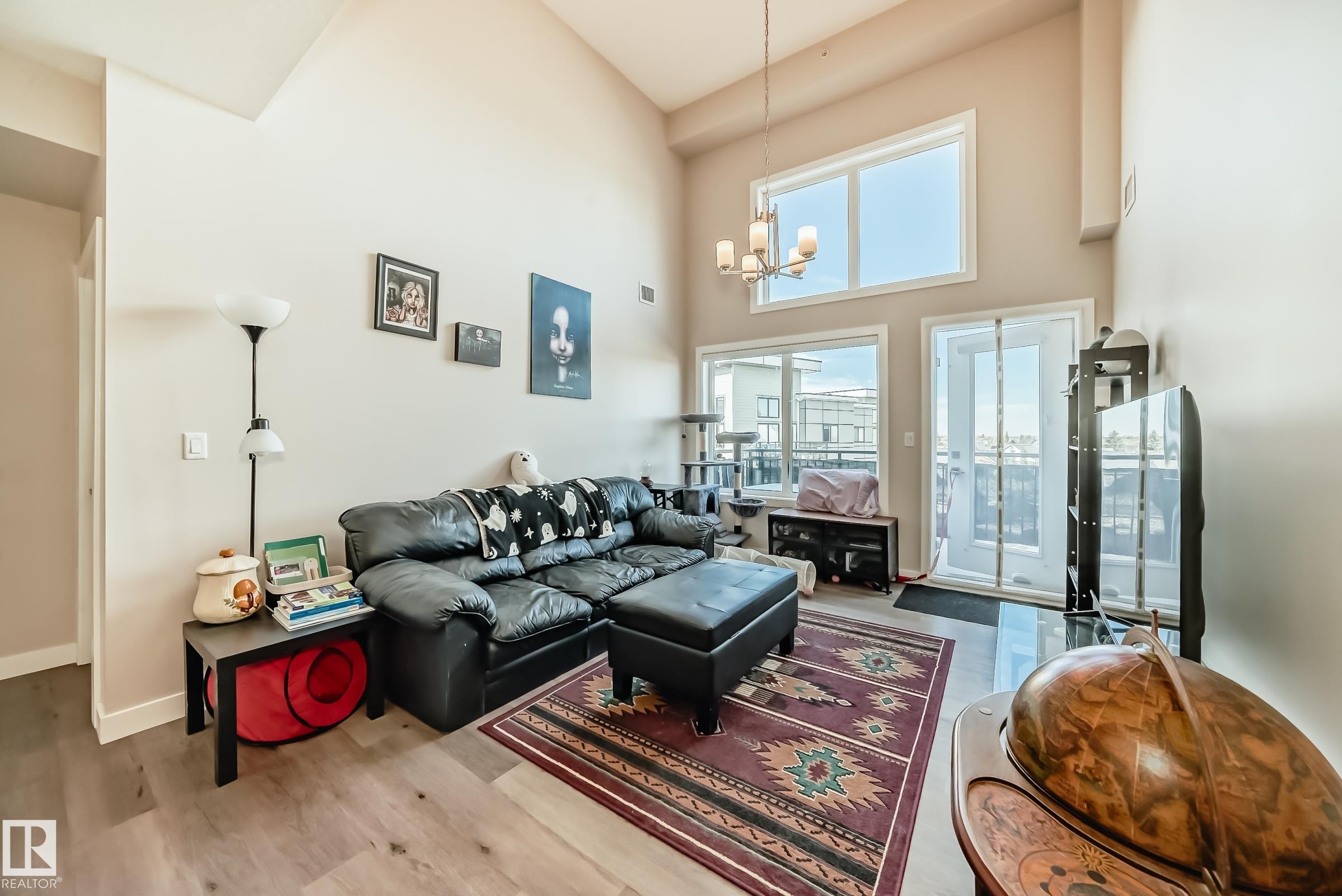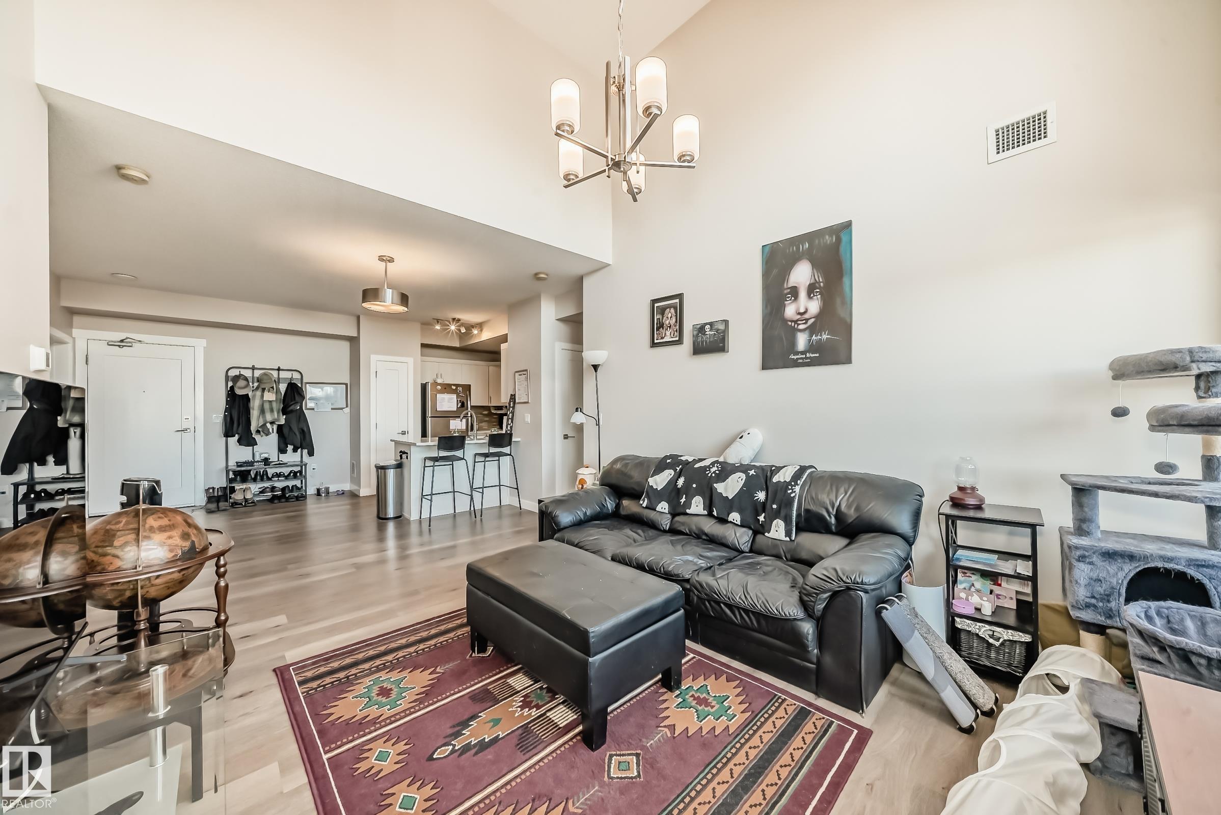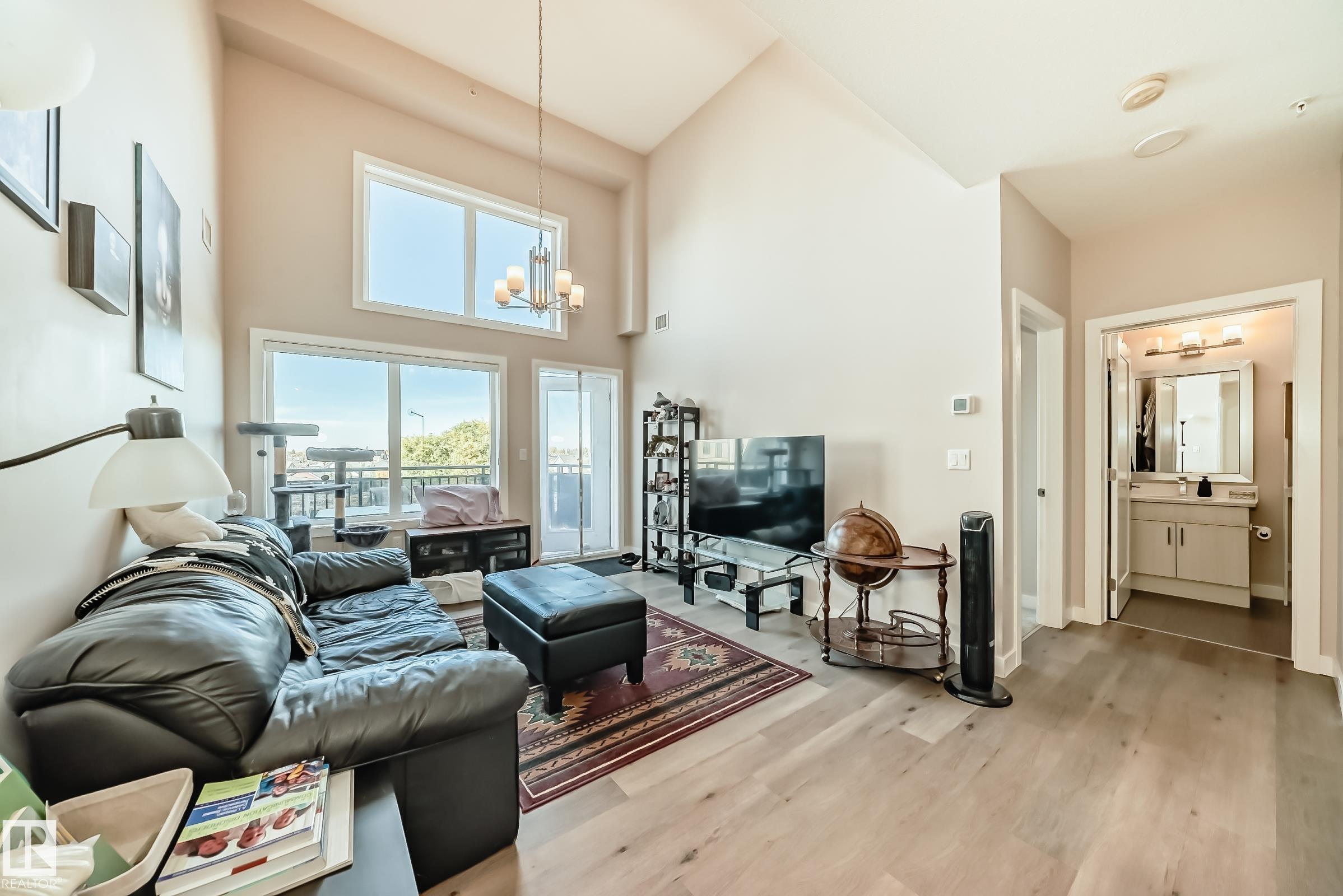 The Connaught at Griesbach - Welcome home to this stunning top-floor, north-facing 2 bedroom, 2 bathroom suite featuring a bright open-concept design and modern finishes throughout. With a builder's size of 1,000 sq. ft., this suite offers quartz countertops, soft-close cabinetry, and low-maintenance vinyl plank flooring in the main living areas, complemented by plush carpet in the bedrooms. The impressive two-storey living room is filled with natural light from expansive windows, with a bedroom conveniently located on each side for added privacy. Step out onto the spacious deck, complete with a natural gas hookup for barbecuing. Enjoy the many building amenities, including a fitness centre, social/amenity room, library, car wash bay, and secure key fob access. Additional features include Hunter Douglas window coverings, stainless steel appliances, in-suite laundry with stacking washer and dryer, and one underground parking stall. Building was treated with fire retardant spray during construction.