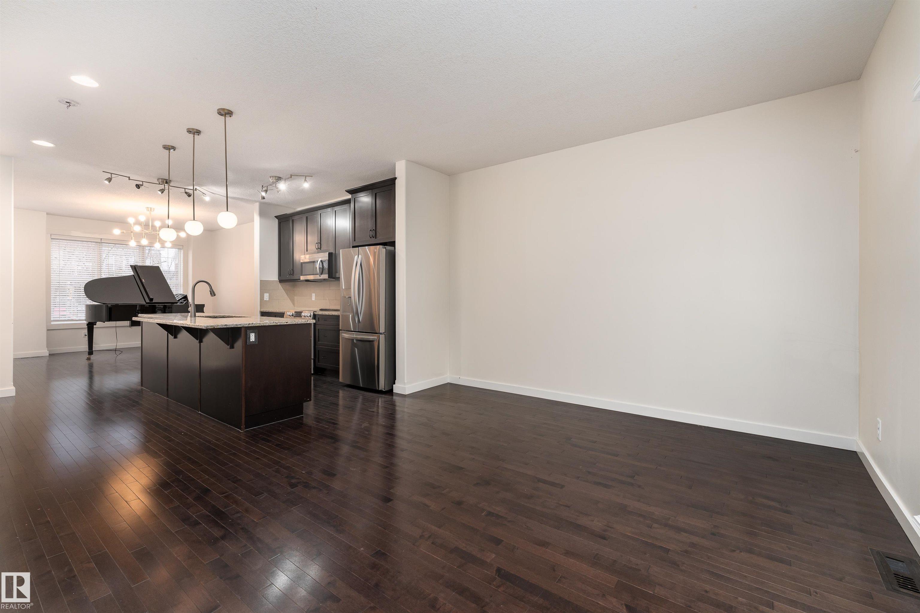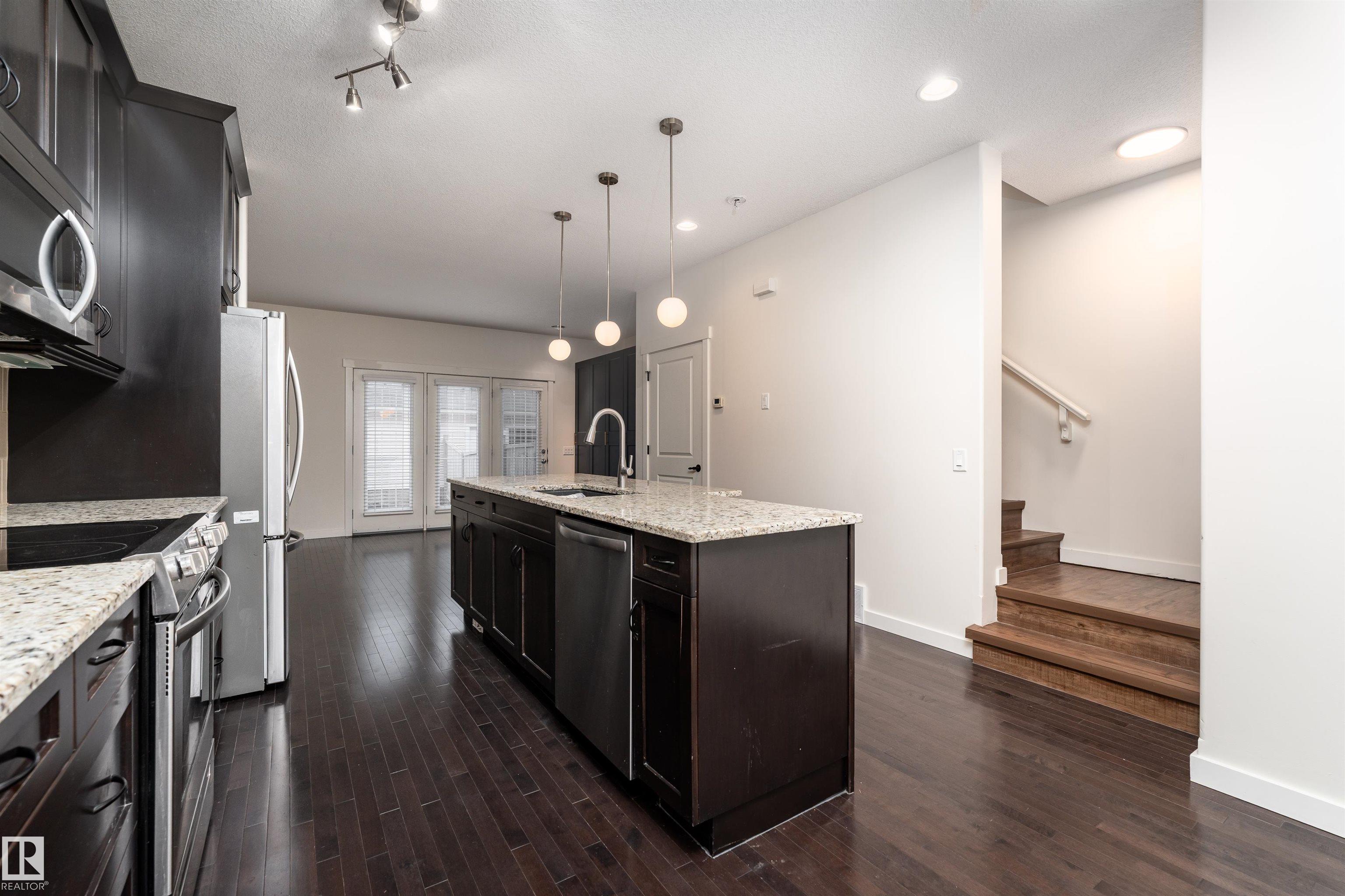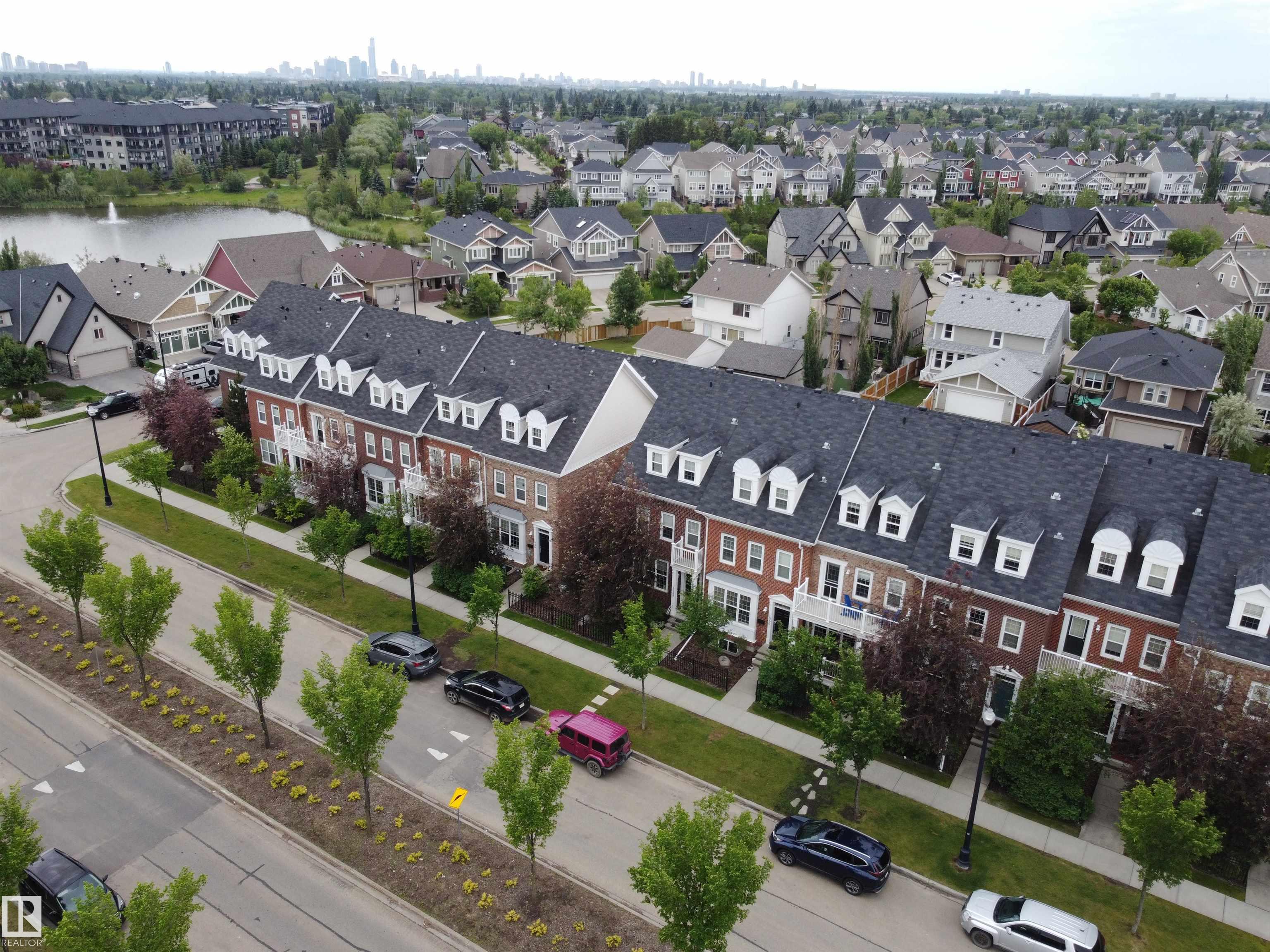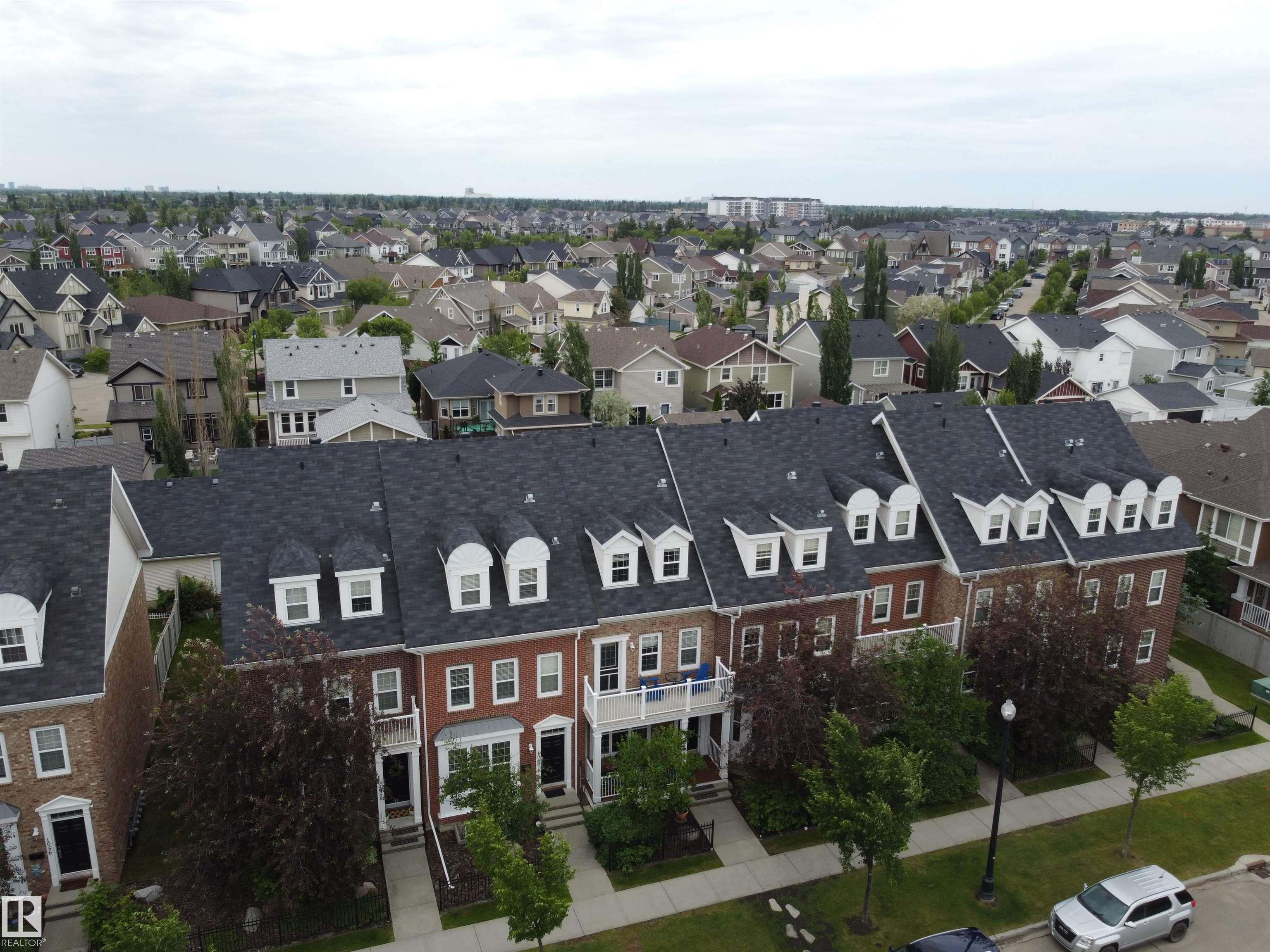 Welcome to this stylish 3-storey townhome in the charming and convenient community of Griesbach! The open-concept main floor offers flexible living and dining spaces, with a central kitchen featuring ceiling-height cabinetry, granite counter tops with a large island, newer appliances, fresh paint, no carpet and chevron style floors in the primary suite. The second floor offers two spacious bedrooms with large closets, a 4-piece bath complete with soaker tub and separate shower, plus convenient upstairs laundry. The top floor is your private primary retreat, featuring vaulted ceilings, a charming Juliet balcony, and a spa-like 5-piece ensuite with dual vanities, a soaker tub, separate shower, and a massive walk-in closet you'll love. Photos may include virtual staging for visualization purposes. To round it off, enjoy a landscaped yard, central AC and detached garage. Located just steps from walking trails, lakes, shops, and more -- this is Griesbach living at its finest!