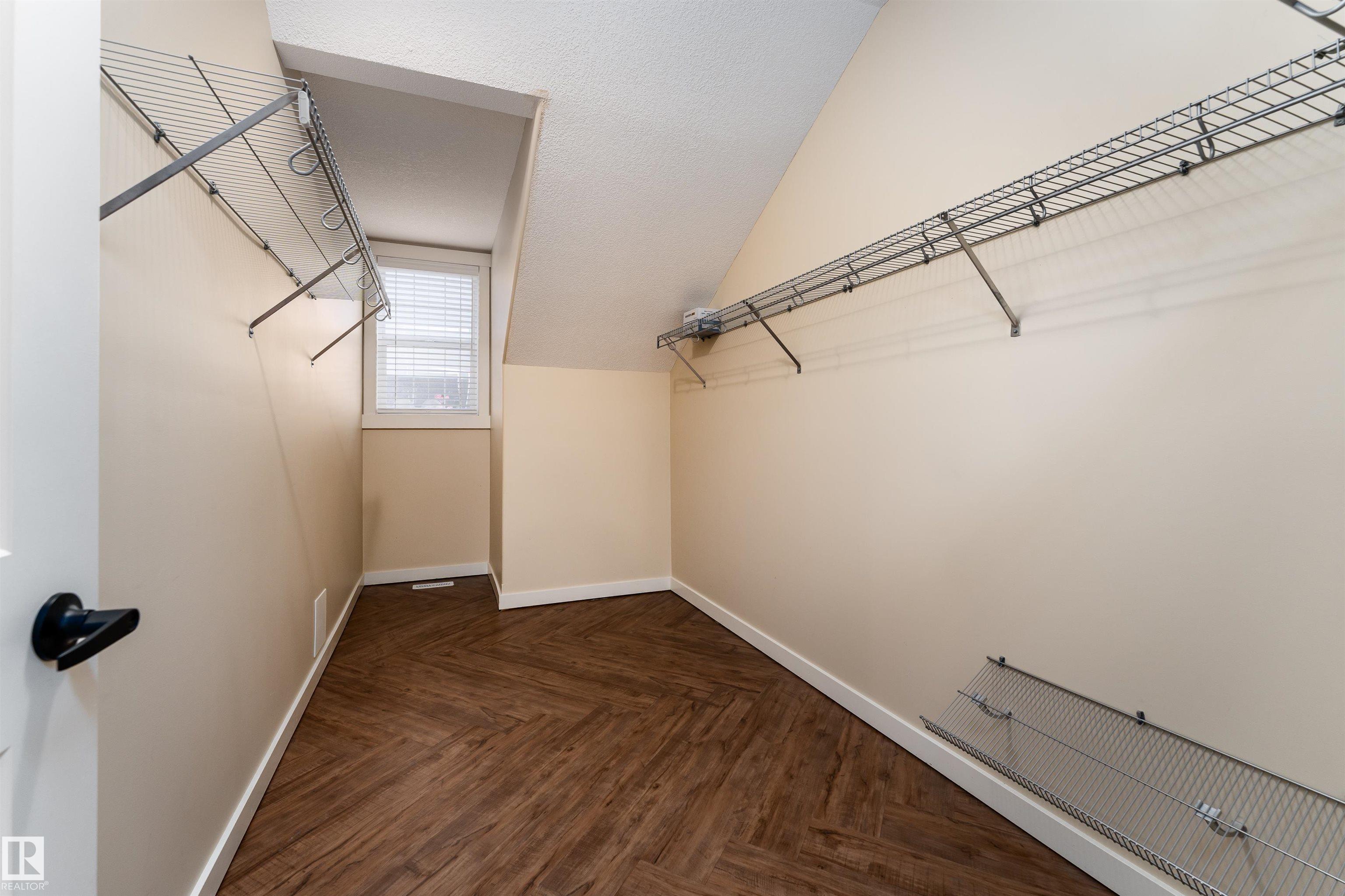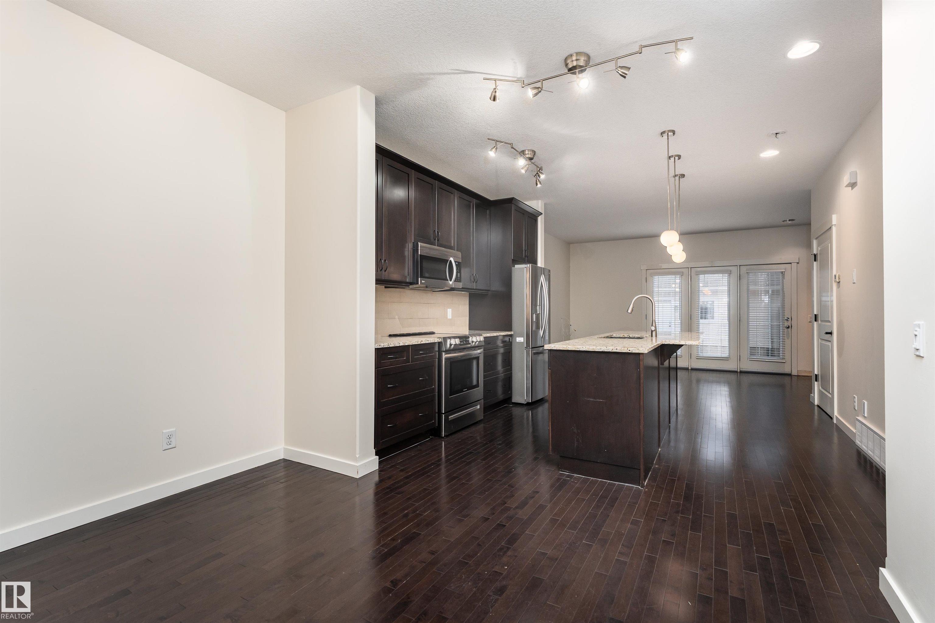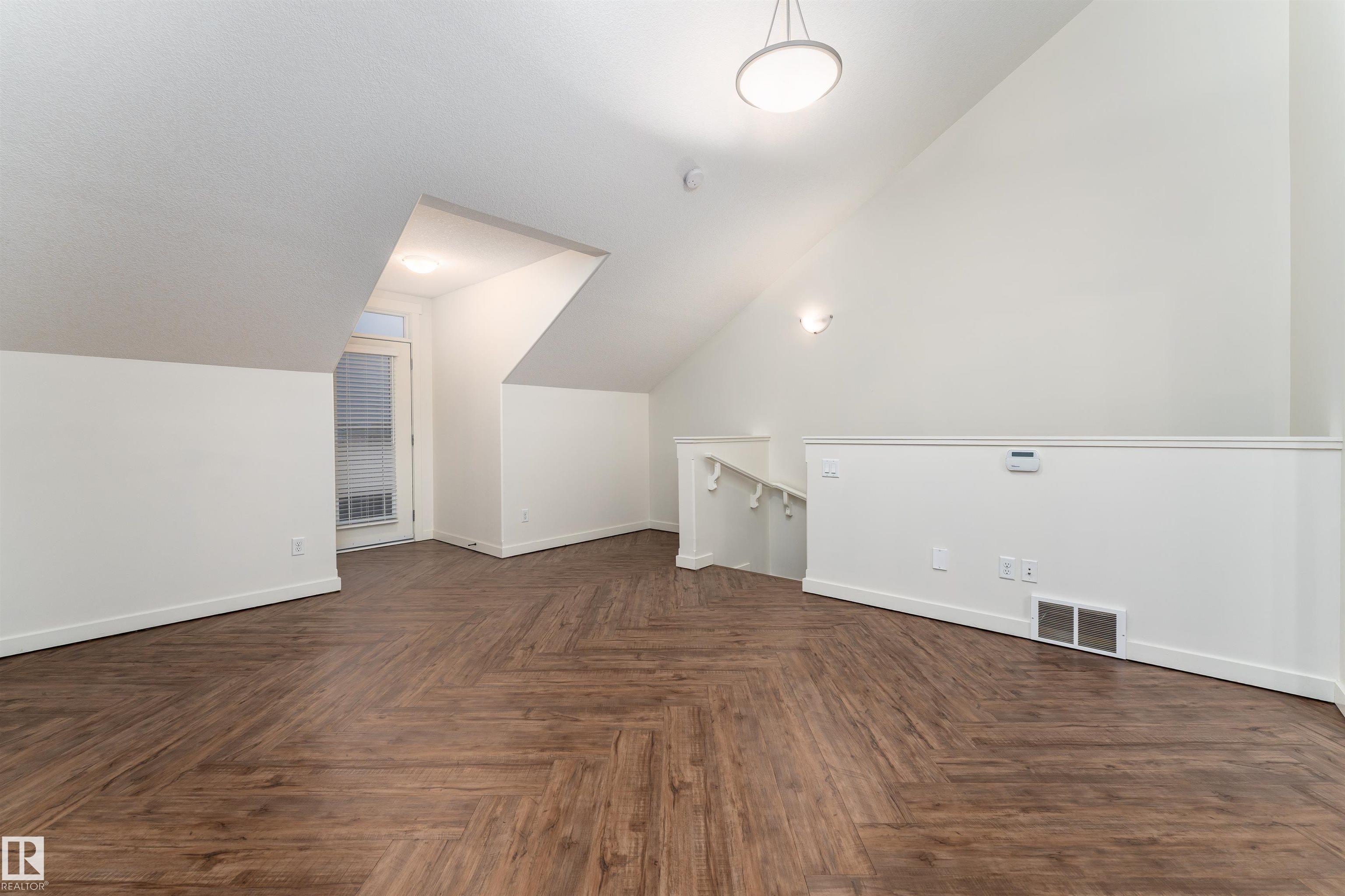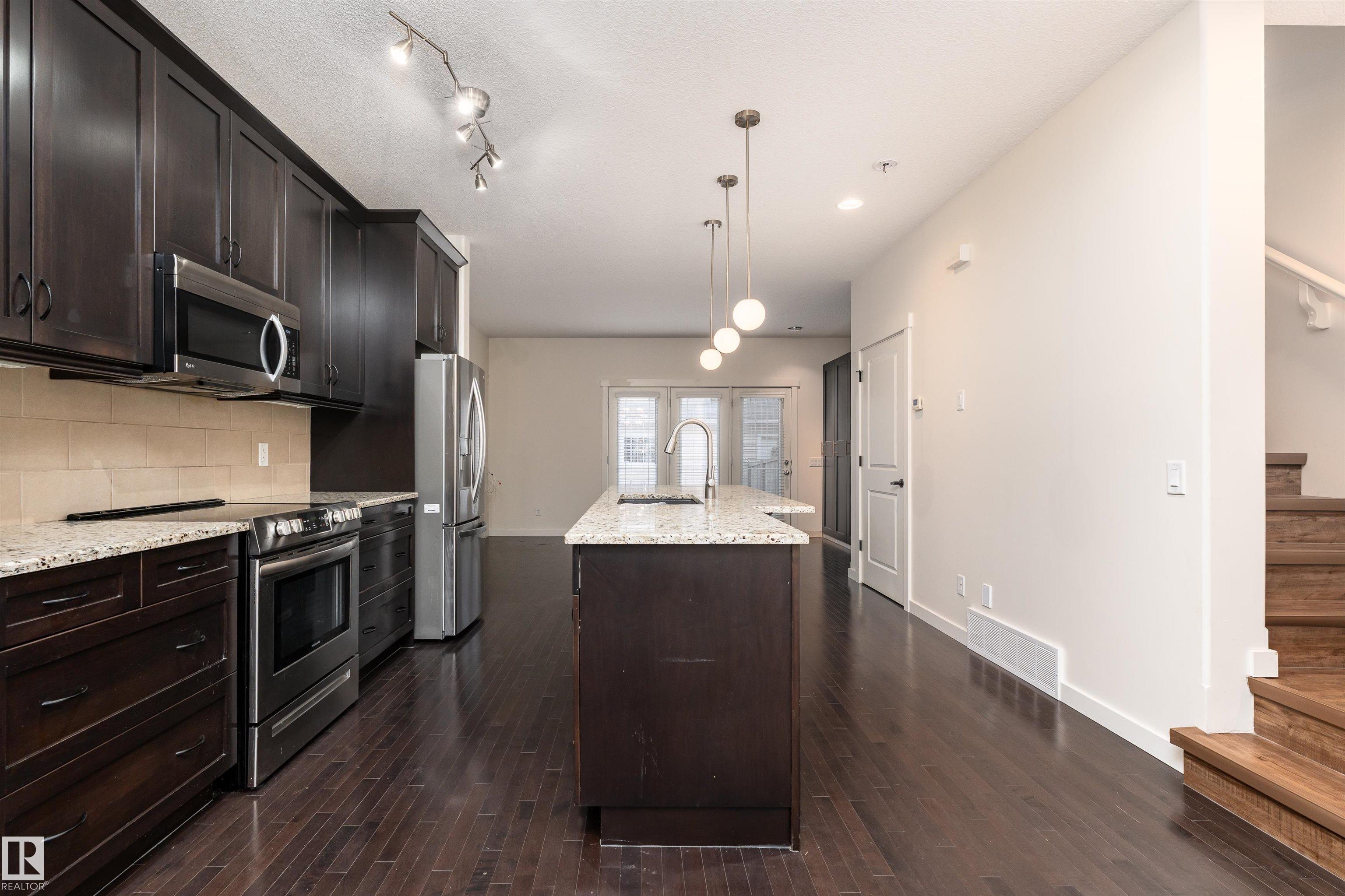 Welcome to this stylish 3-storey townhome in the charming and convenient community of Griesbach! The open-concept main floor offers flexible living and dining spaces, with a central kitchen featuring ceiling-height cabinetry, granite counter tops with a large island, newer appliances, fresh paint, no carpet and chevron style floors in the primary suite. The second floor offers two spacious bedrooms with large closets, a 4-piece bath complete with soaker tub and separate shower, plus convenient upstairs laundry. The top floor is your private primary retreat, featuring vaulted ceilings, a charming Juliet balcony, and a spa-like 5-piece ensuite with dual vanities, a soaker tub, separate shower, and a massive walk-in closet you'll love. Photos may include virtual staging for visualization purposes. To round it off, enjoy a landscaped yard, central AC and detached garage. Located just steps from walking trails, lakes, shops, and more -- this is Griesbach living at its finest!