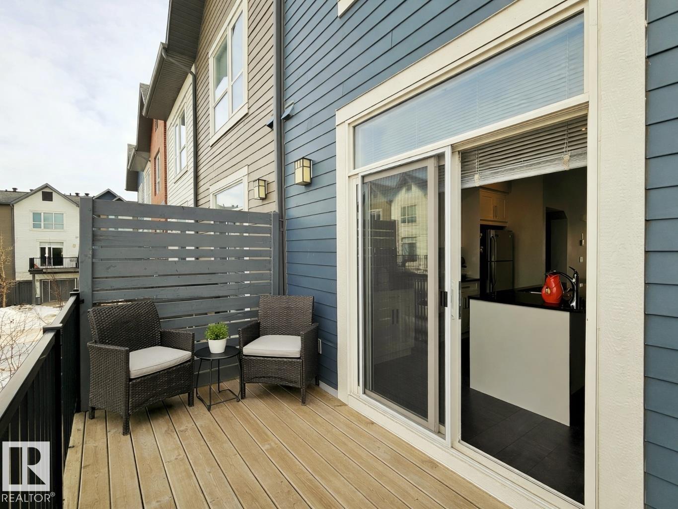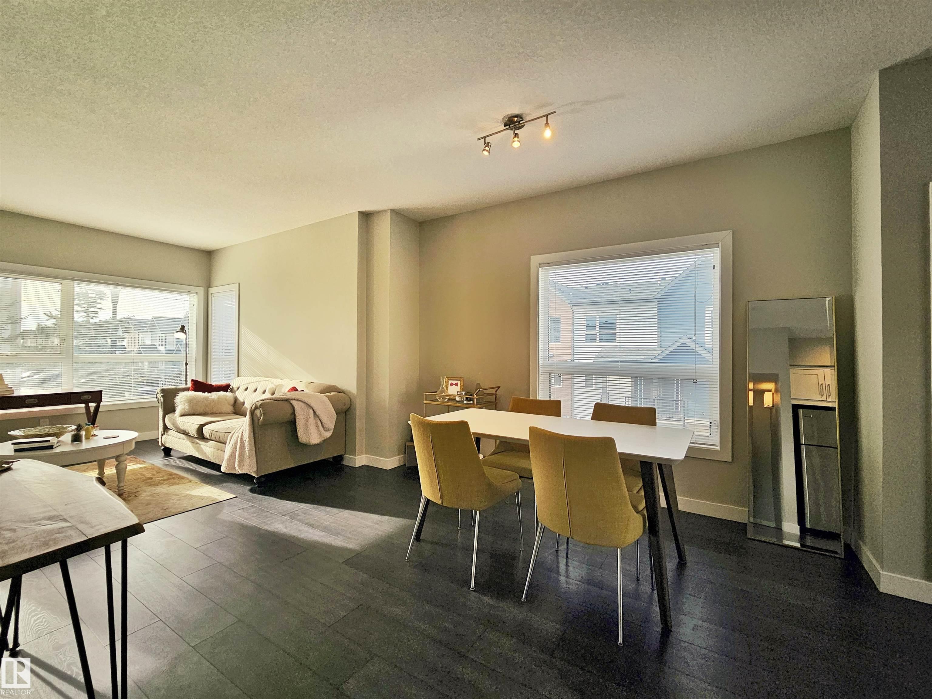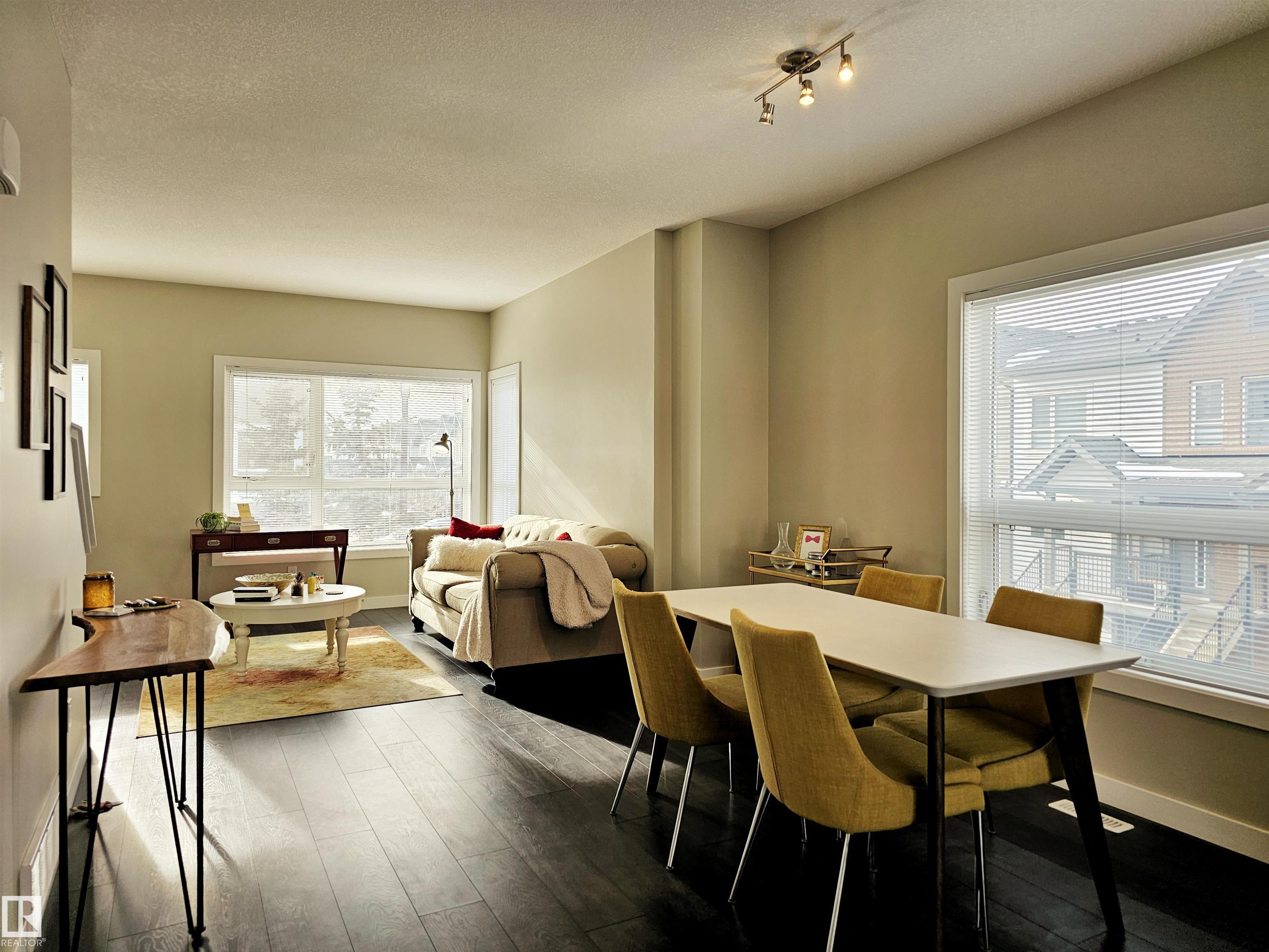 Proudly presented by the ORIGINAL OWNERS, this impeccably maintained END UNIT townhome blends timeless finishes with an exceptional location & oversized single ATTACHED GARAGE. Offering 1,358 sq ft of open-concept living, the home is defined by rich espresso laminate flooring, soaring 9' ceilings, granite surfaces throughout, & expansive windows that fill the space with natural light. The main level features a functional den, elegant 2-pc bath, and direct garage access. At the heart of the home, a beautifully appointed kitchen showcases crisp white cabinetry, S/S appliances, PRIVATE BALCONY access, and a large island overlooking the warm dining and living areas. Upstairs you'll find a 4-pc bath, laundry, bonus room, spacious second bedroom, and a south-facing primary retreat with double closets and 3-pc ensuite. Perfectly positioned just minutes from downtown, with nearby schools, trails, & everyday amenities along 97 St & Northgate Centre, all in a professionally managed enclave with low condo fees $328.