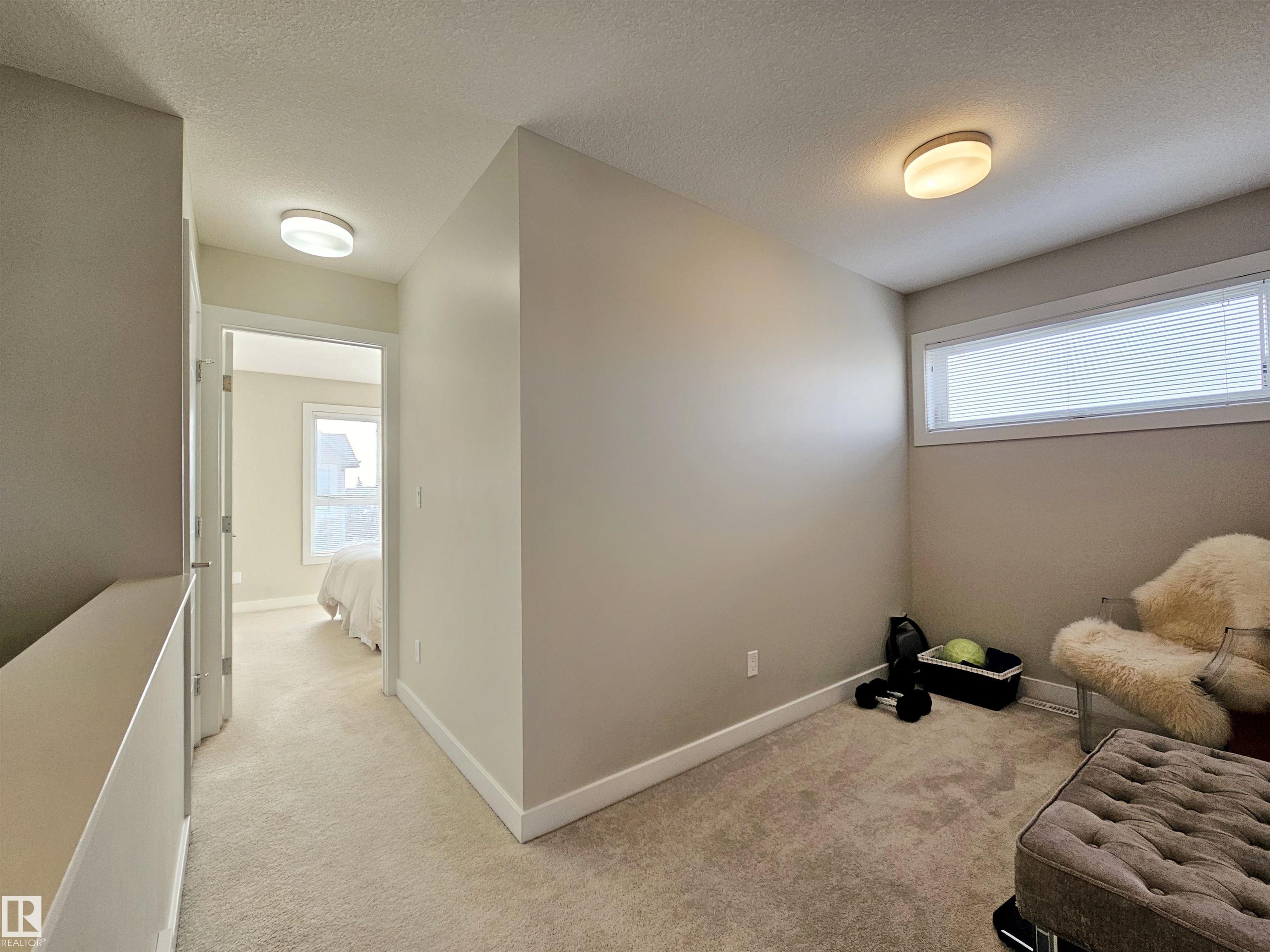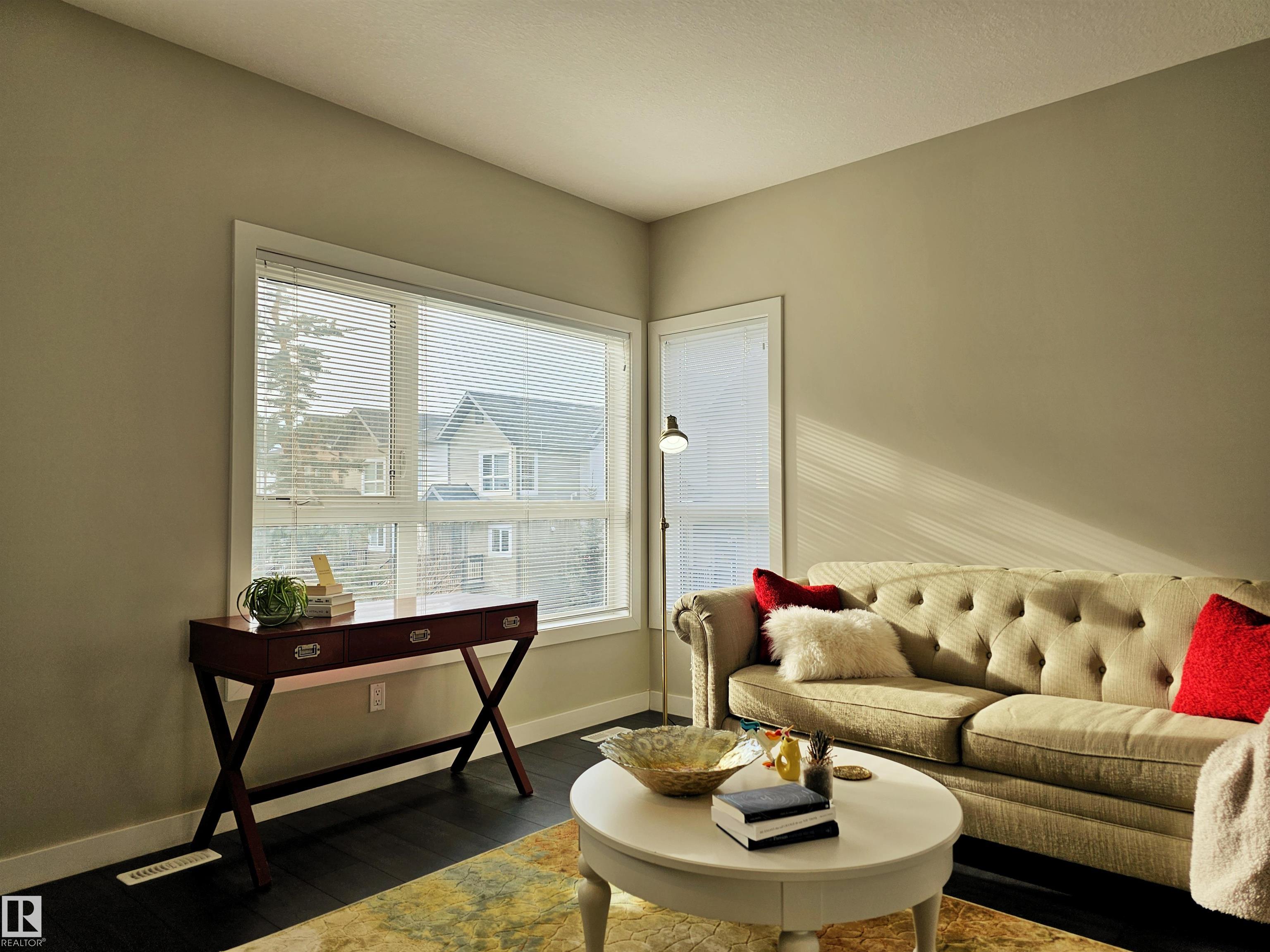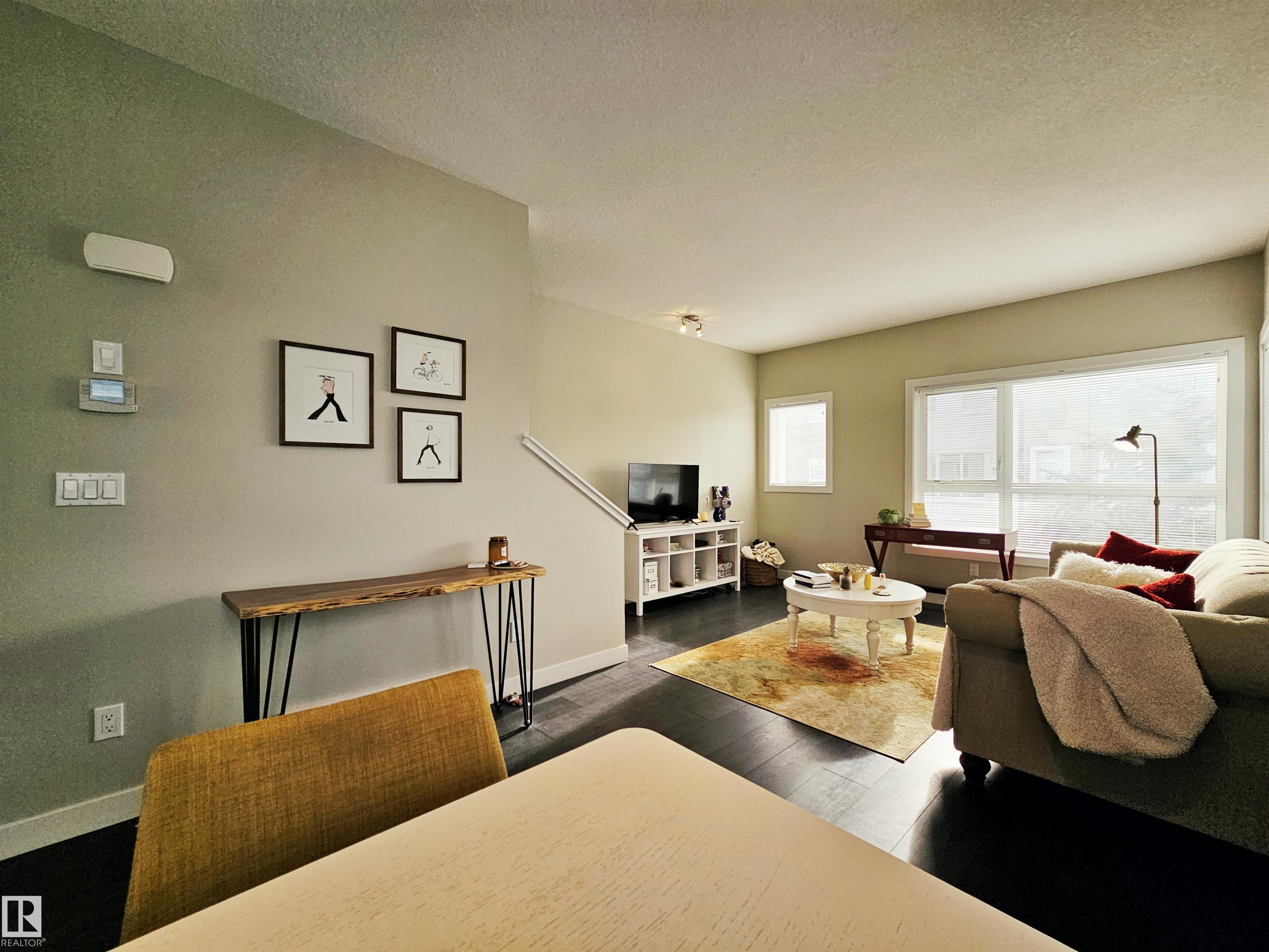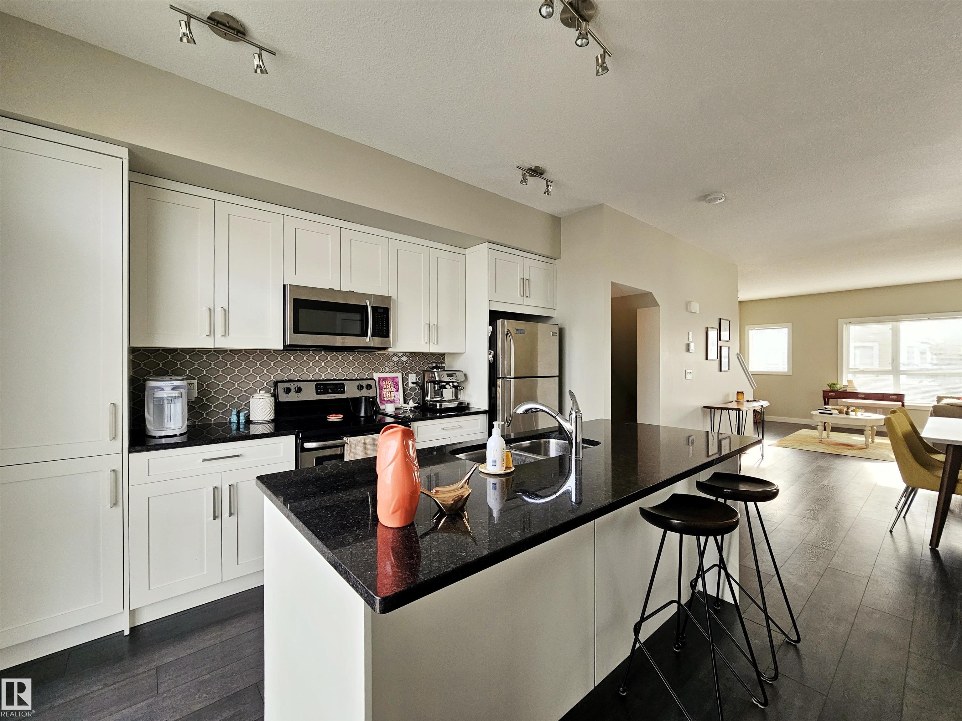 Proudly presented by the ORIGINAL OWNERS, this impeccably maintained END UNIT townhome blends timeless finishes with an exceptional location & oversized single ATTACHED GARAGE. Offering 1,358 sq ft of open-concept living, the home is defined by rich espresso laminate flooring, soaring 9' ceilings, granite surfaces throughout, & expansive windows that fill the space with natural light. The main level features a functional den, elegant 2-pc bath, and direct garage access. At the heart of the home, a beautifully appointed kitchen showcases crisp white cabinetry, S/S appliances, PRIVATE BALCONY access, and a large island overlooking the warm dining and living areas. Upstairs you'll find a 4-pc bath, laundry, bonus room, spacious second bedroom, and a south-facing primary retreat with double closets and 3-pc ensuite. Perfectly positioned just minutes from downtown, with nearby schools, trails, & everyday amenities along 97 St & Northgate Centre, all in a professionally managed enclave with low condo fees $328.