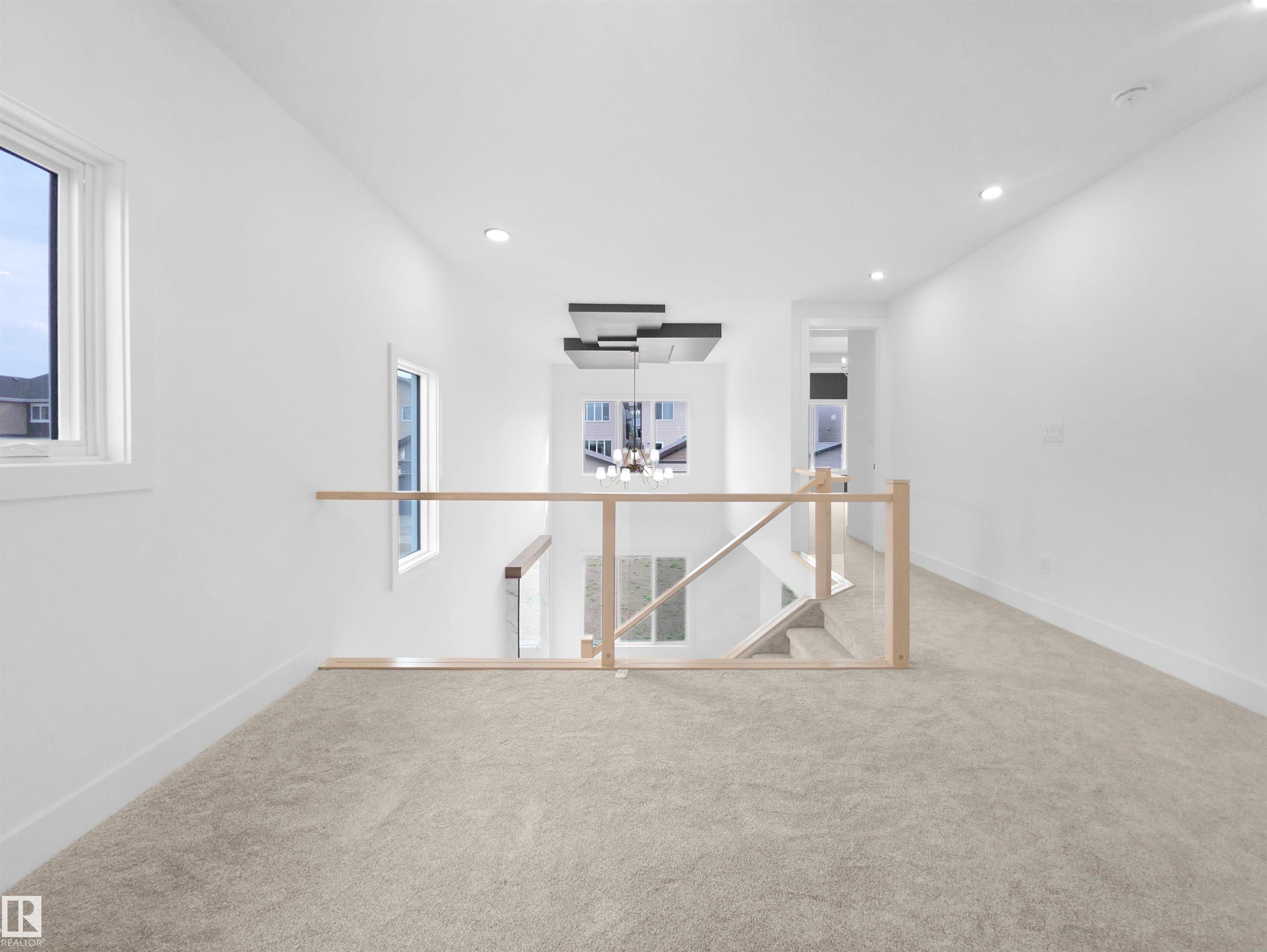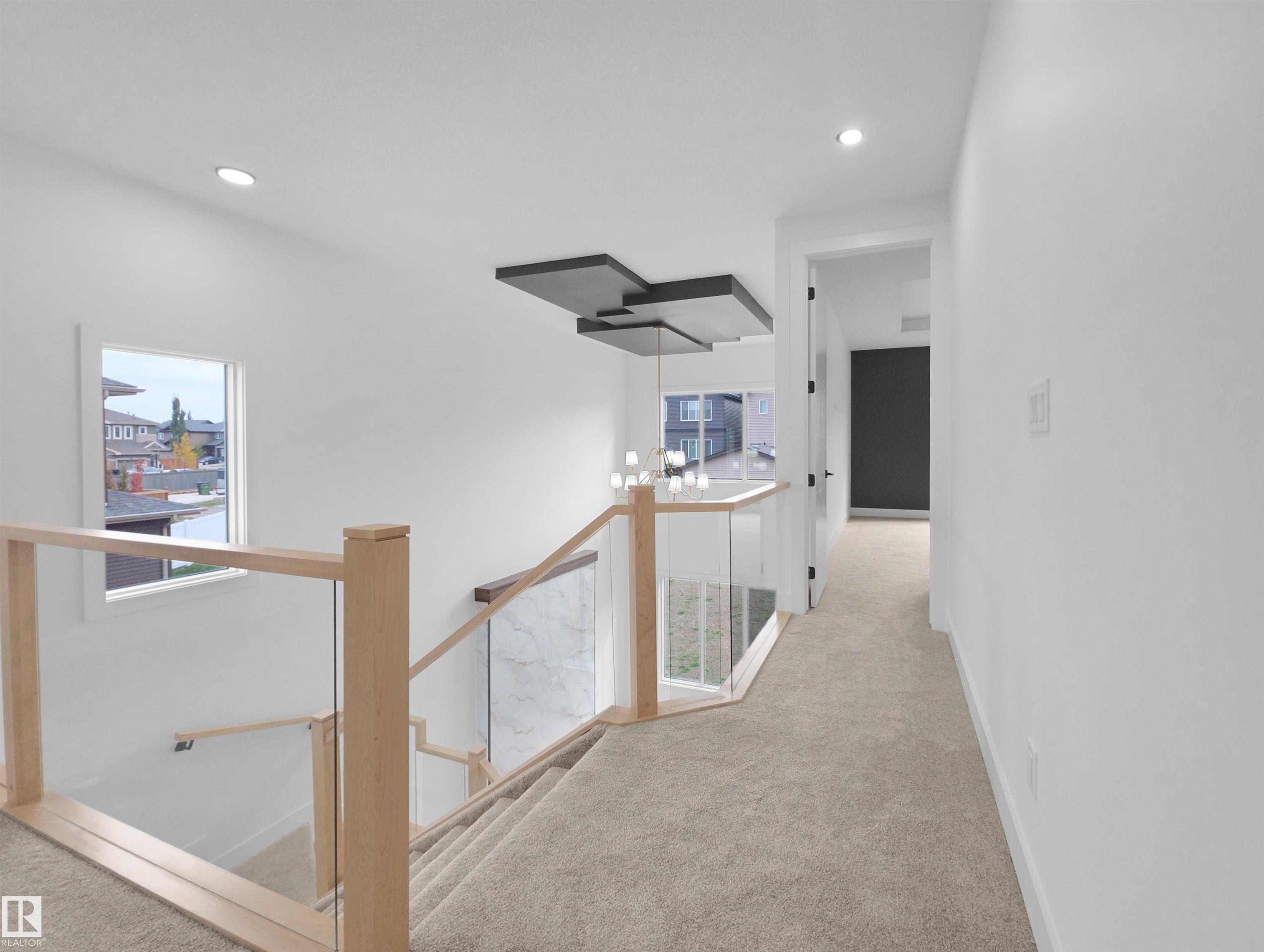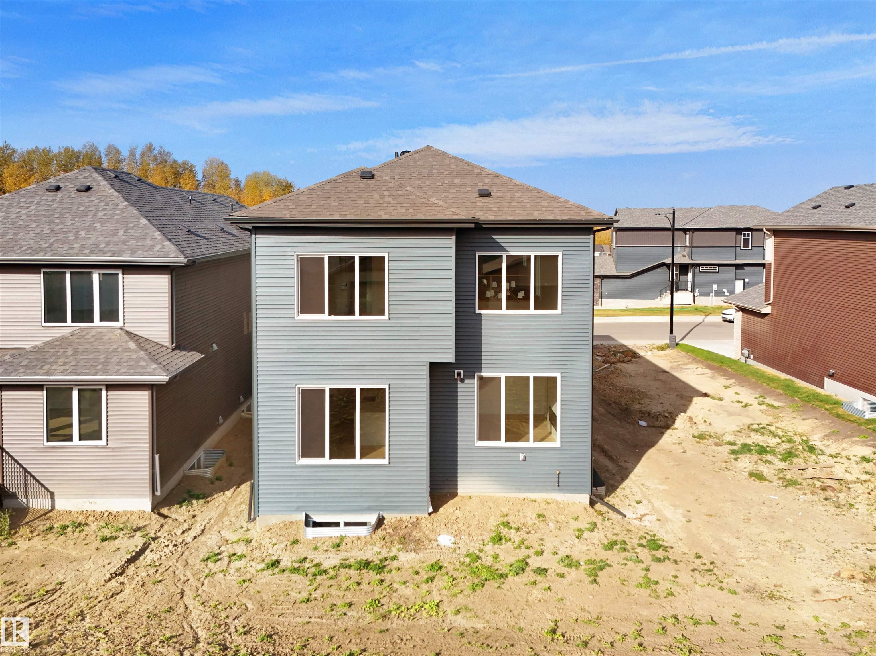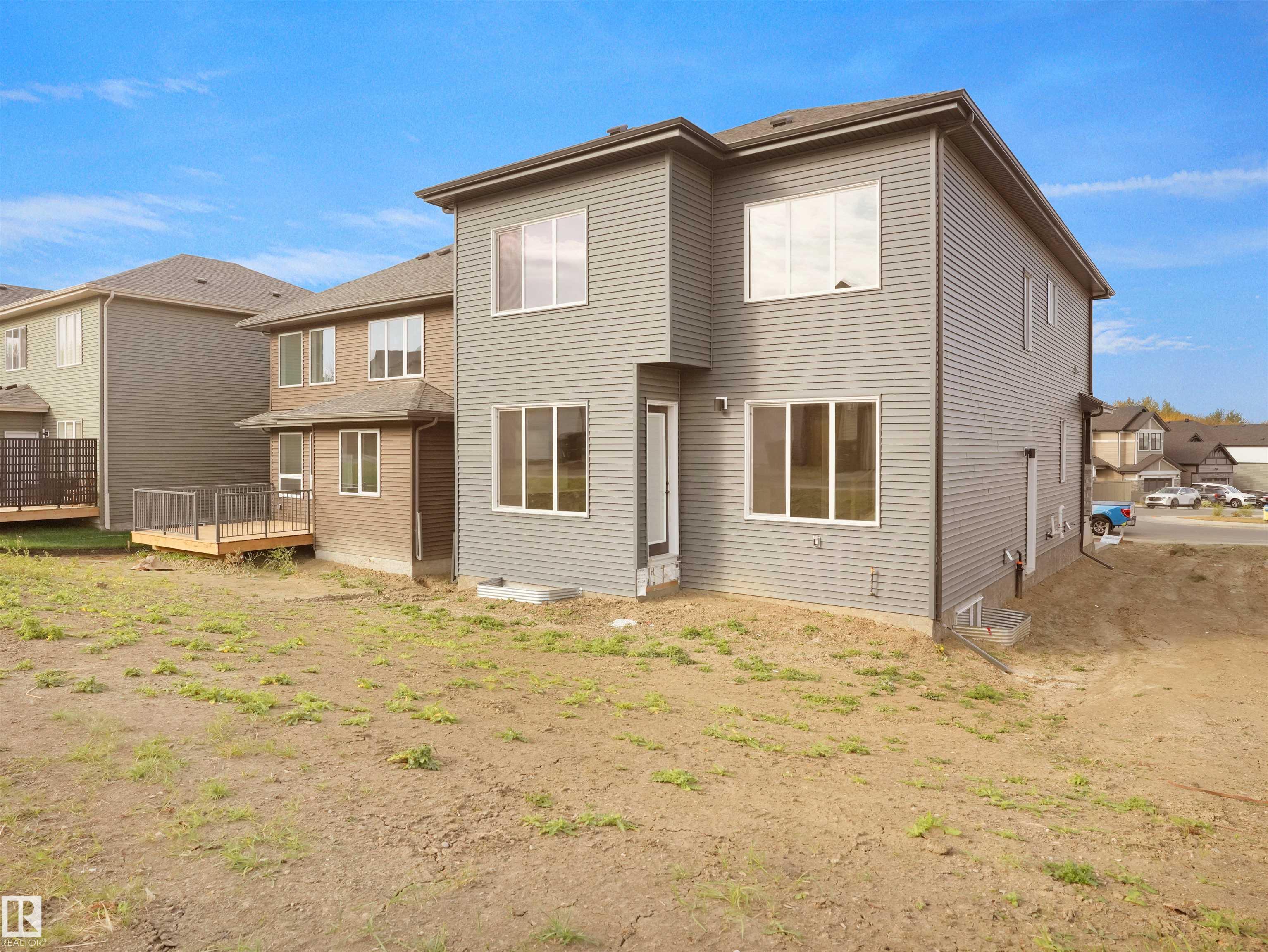 Welcome to this elegant 2680 Sq ft. 5 rooms, 4-bath custom home, in Hawks Ridge, a community surrounded by scenic walking trails, ponds & preserved natural beauty and its nestled beside Big Lake & Lois Hole Provincial Park. The main level features a DEN with full 3-pc bath, a dramatic open-to-above living room, a spice kitchen, a chef-inspired extended kitchen with spacious dining area, 10' ceilings throughout and a mudroom with access to the double attached garage. Upstairs offers 4 bedrooms, 3 full bathrooms, a bonus room, and laundry room with Quartz Counter and cabinetry. Thoughtfully upgraded with BUILT-IN APPLIANCES, BLINDS, MDF SHELVING, 8' DOORS, upgraded light fixtures including chandelier, feature walls, black hardware, QUARTZ COUNTERTOPS WITH WATERFALL KITCHEN ISLAND and more. A side entrance to the basement provides excellent future suite potential.