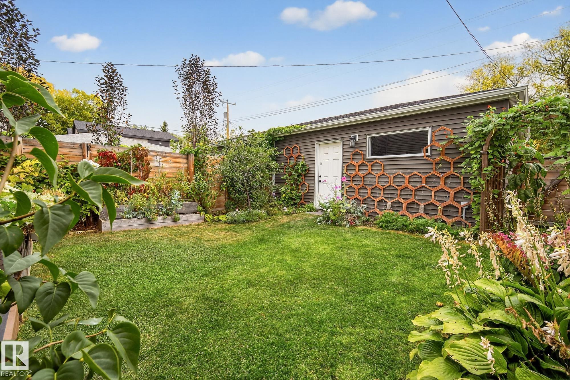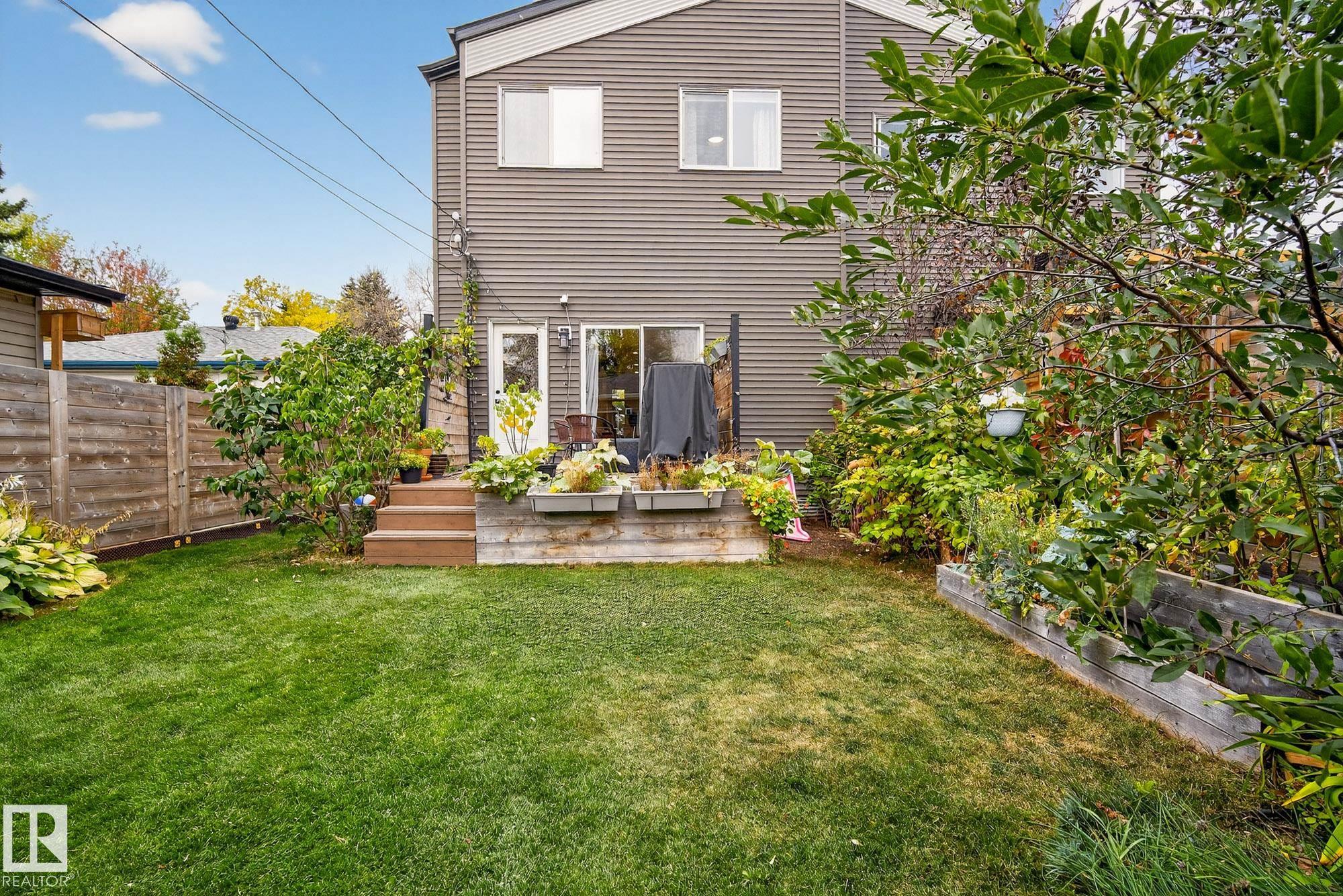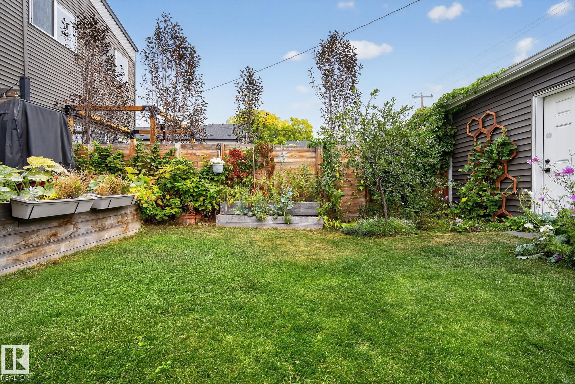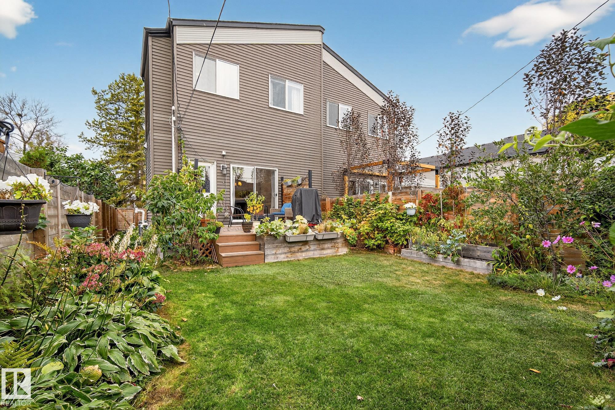 HELLO CHARMING! Welcome home to this OG Accent Infills half-duplex located in historic Inglewood located walking distance to Westmount Jr High, Westmount Shopping Centre + trendy 124 St. Shopping District. The stunning perennial cottage garden in the backyard will have you SWOONING! Inside, you're greeted by beautiful hickory hardwood floors, large open living space, and a spacious kitchen with patio doors leading to your deck + detached double garage. Upper level features 3 bedrooms, laundry room and convenient tech space. You'll be WOWED by the primary retreat with its huge vaulted ceilings, massive windows, and gorgeous spa-like ensuite. A/C added in 2023 to keep you cool with your massive windows! Basement left untouched for you to create the space you desire - complete with SIDE ENTRANCE for those looking to develop a basement suite.