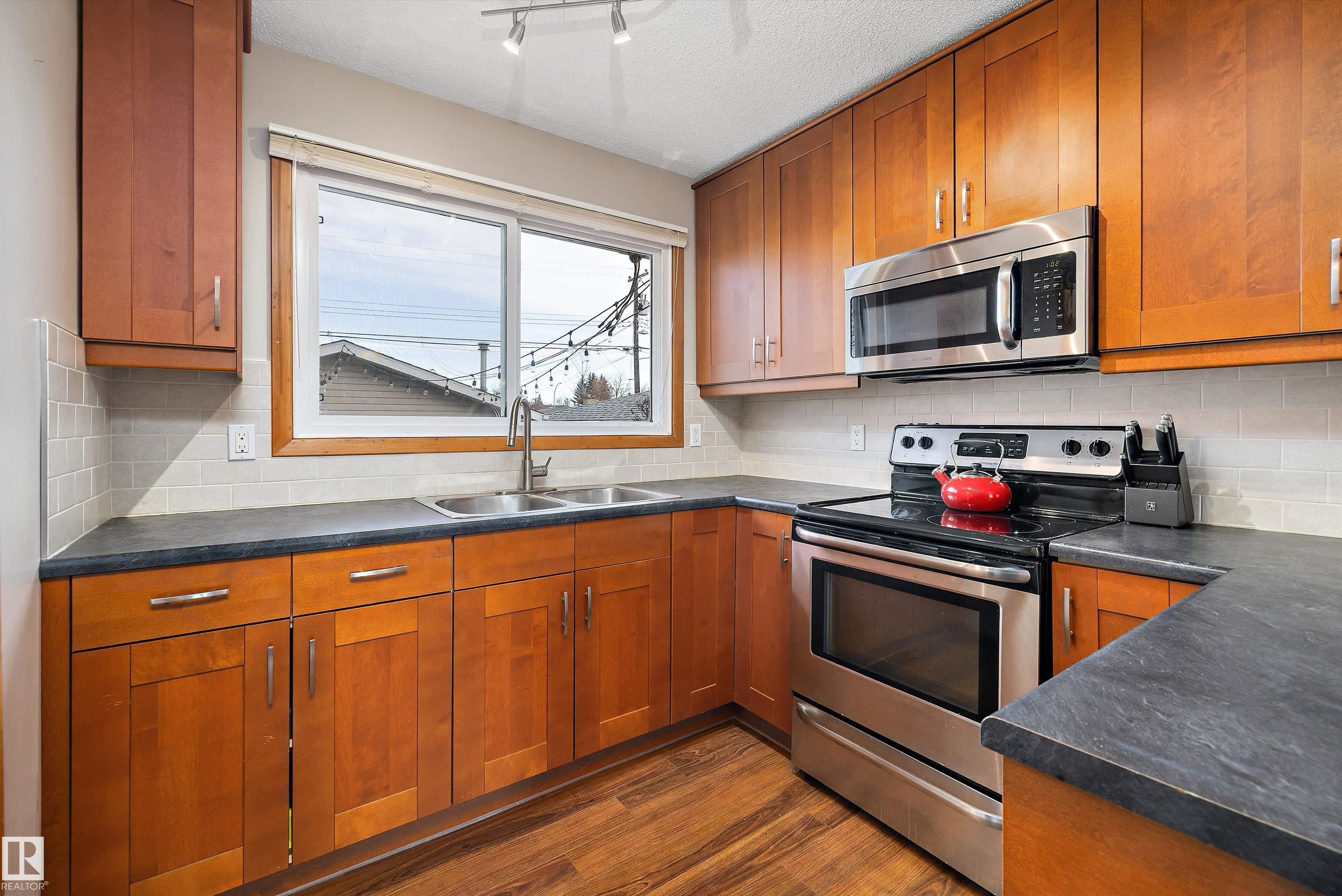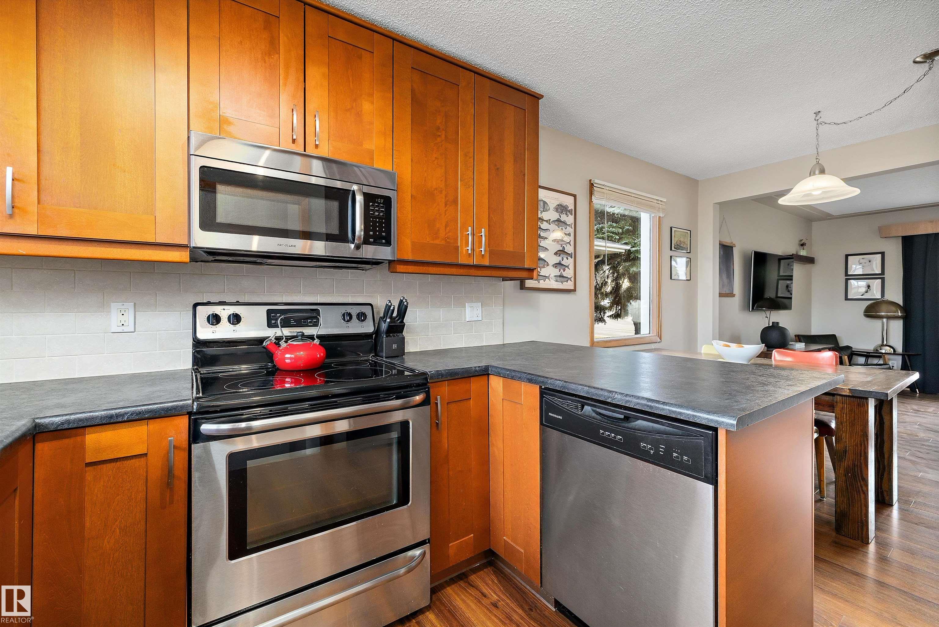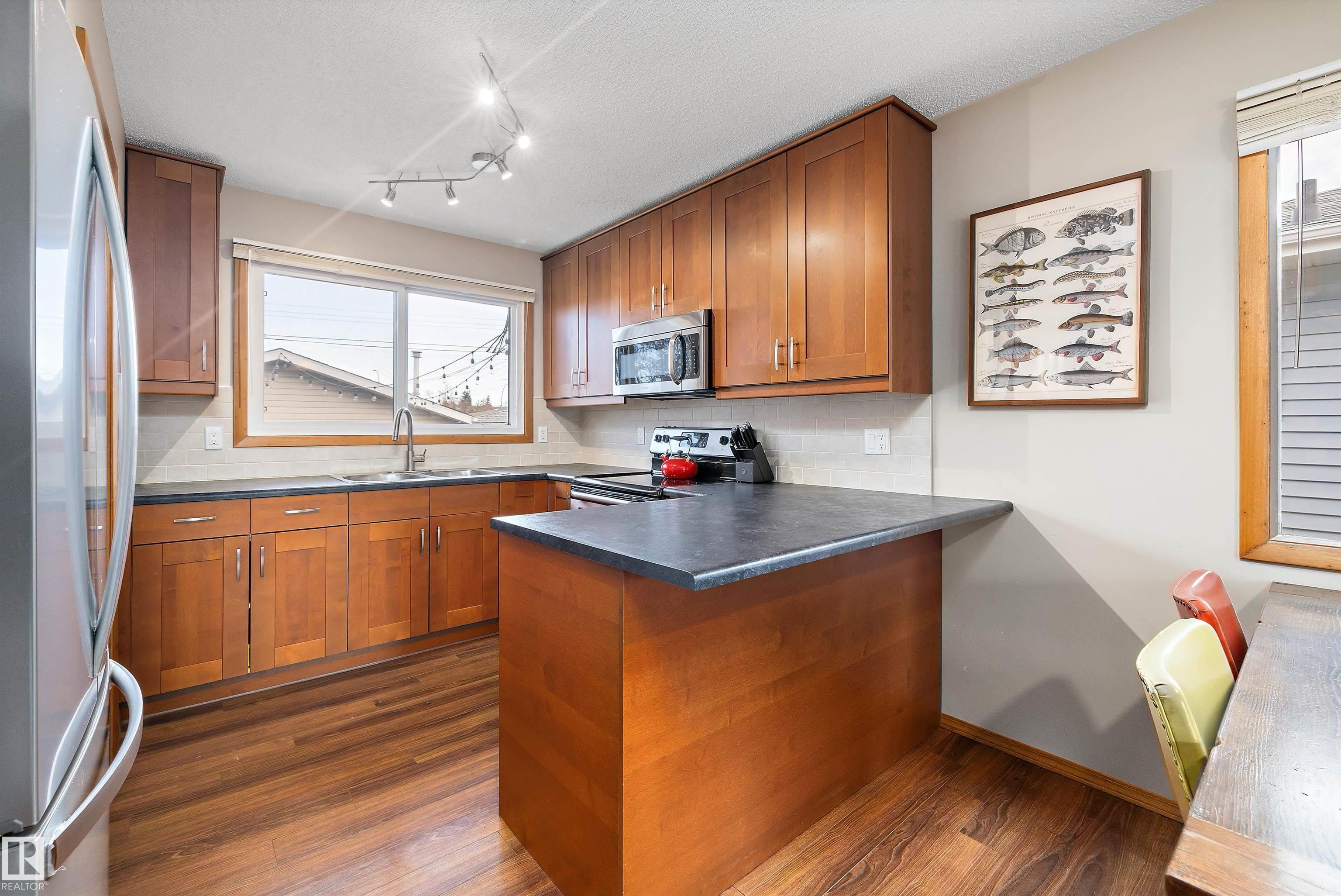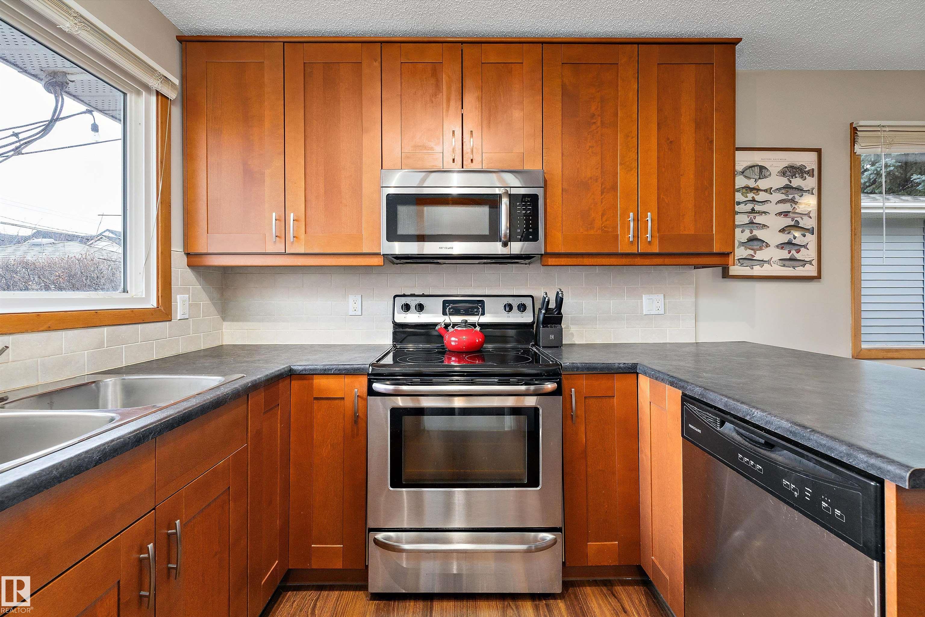 Welcome to Kenilworth. This beautifully renovated 3+2 bedroom home with a double garage offers a warm, inviting layout with modern finishes throughout. The main floor features a bright living room that flows into a stylish kitchen with tall cabinetry, recessed lighting, stainless steel appliances, and a contemporary tile backsplash. Three comfortable bedrooms on the main level, including a primary with a custom floor-to-ceiling glass closet. The updated main bath includes double sinks and fresh tile. The fully finished basement adds two additional bedrooms, a full bathroom, and a spacious family/rec room perfect for movie nights or play space. Upgraded windows and 100 amp electrical panel (house & garage).The garage is heated and insulated. Located in a desirable community close to schools, parks, and amenities--this move-in ready home checks all the boxes.