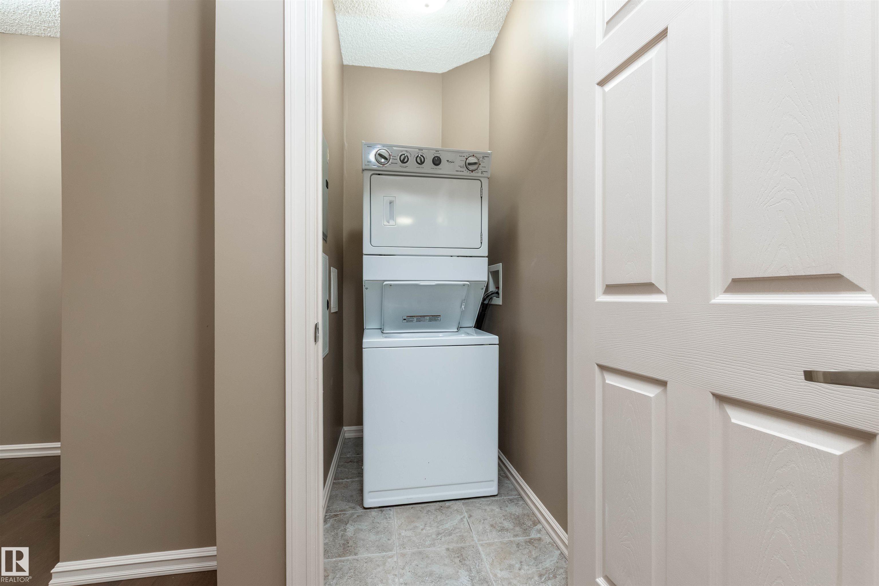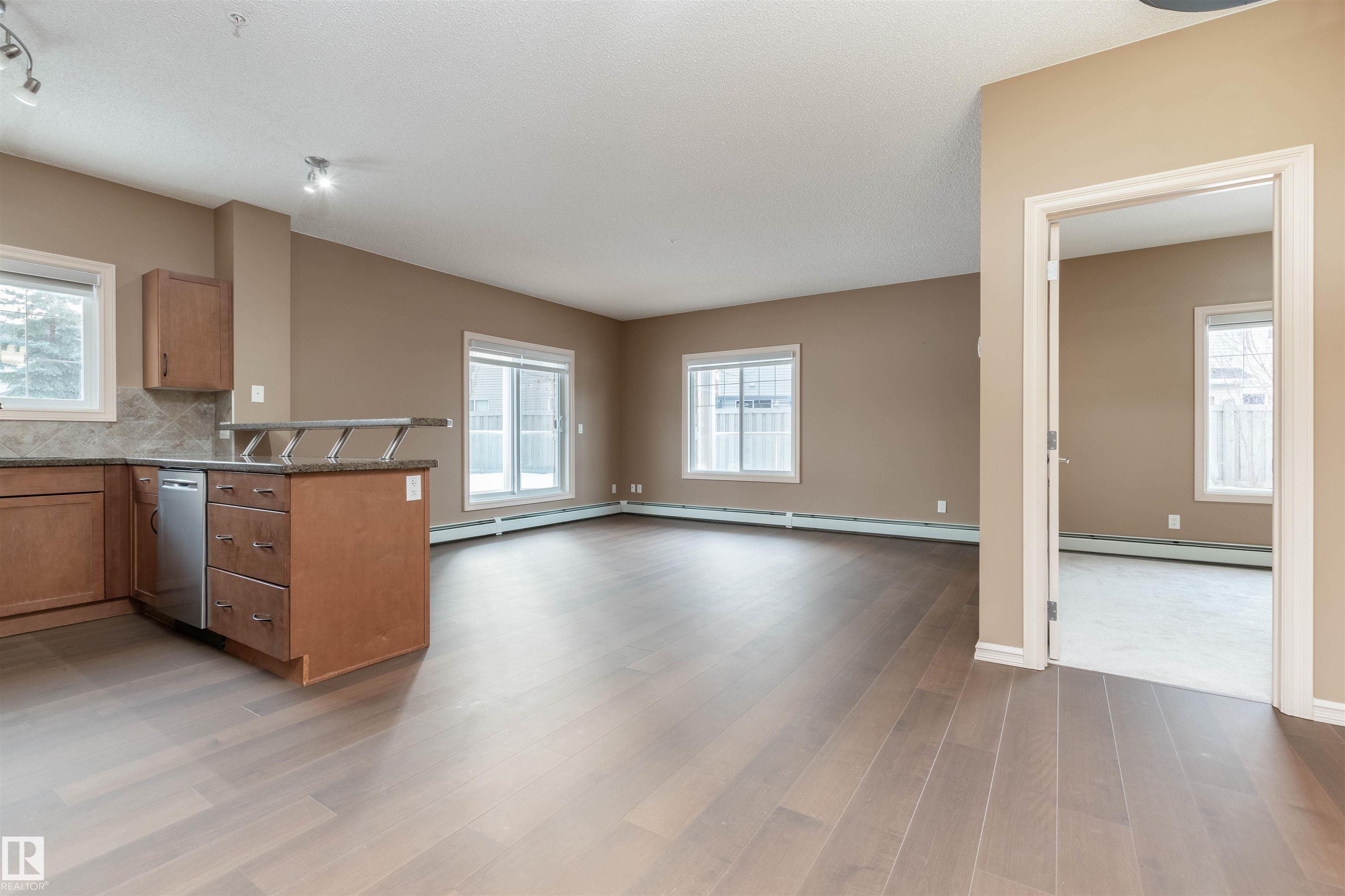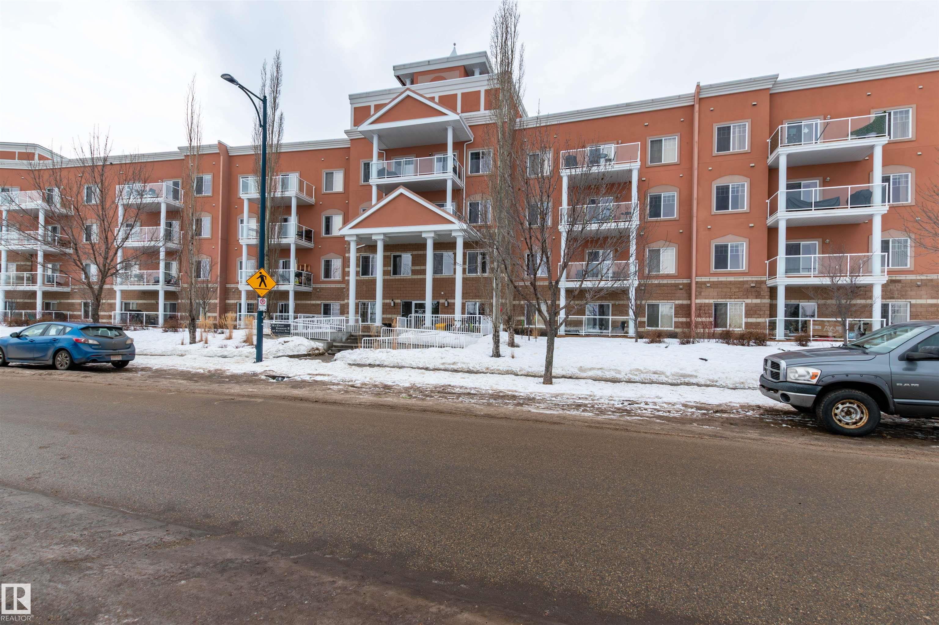 AMAZING CORNER UNIT WITH WRAPAROUND DECK FACING SUNNY PRIVATE COURTYARD! This 2 BR, 2 bath unit with 9-foot ceilings comes with TWO TITLED Parking stalls ( one underground close to elevator and 1 surface stall), plus a large storage room just down the hallway! Upgrades include NEW: paint, engineered flooring, carpet in MBR, refrigerator, kitchen tap and blinds throughout, making this property move-in ready! The chef's kitchen has large granite counters and peninsula and stainless steel appliances. There is even a storage cupboard at the spacious front entry. Primary bedroom is generous in size with walkthrough closets and full ensuite bath. The other bedroom is on the opposite side next to the other full bath. Condo fees include heat, water AND power! Social room and fitness room. Pet-friendly. Walk to the Blackmud Creek Ravine which is close by. Across from park, playground, transit and mere minutes from shopping, the Anthony Henday and Ellerslie Road. Just move in! Some photos Virtually Staged.