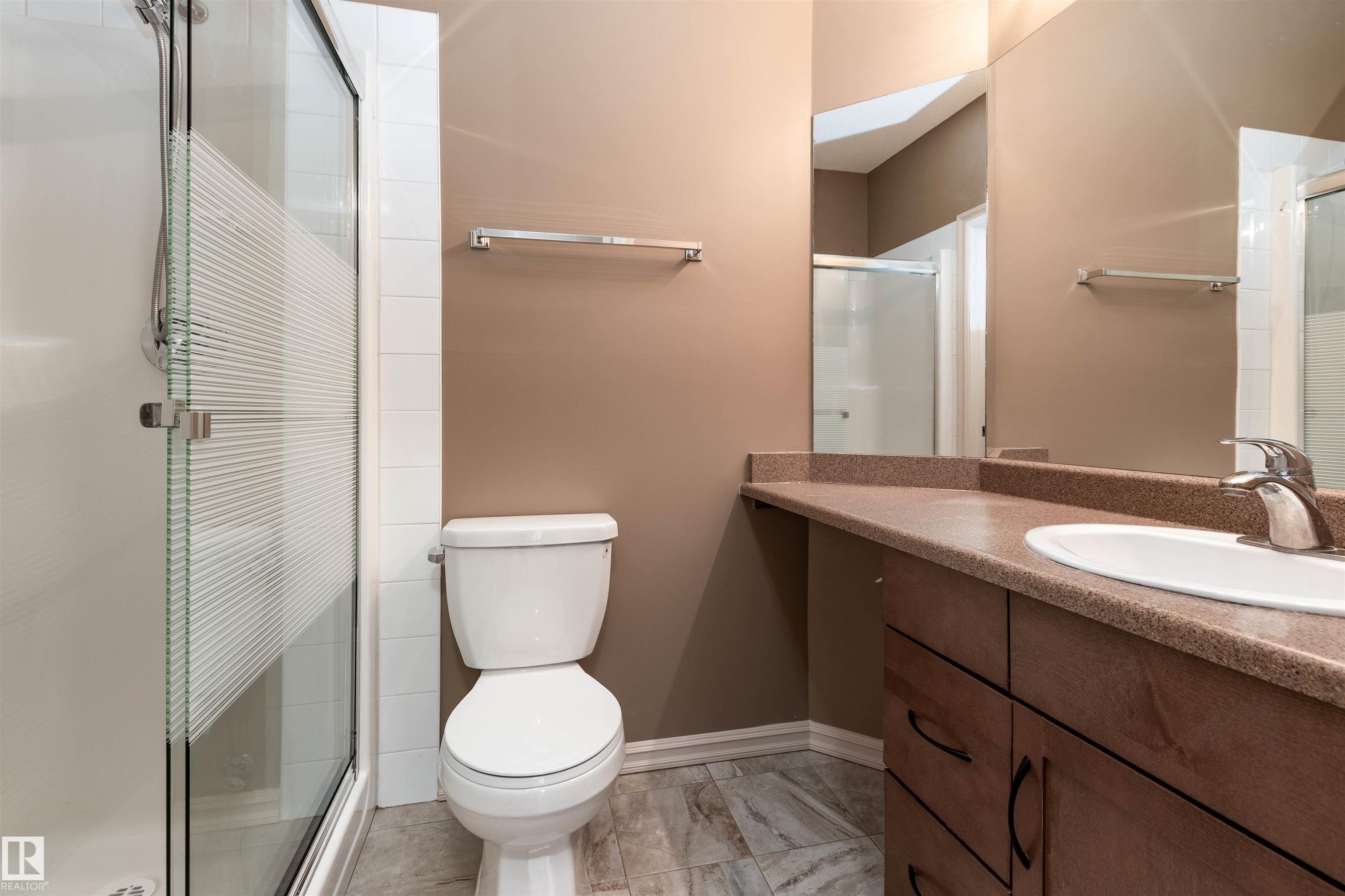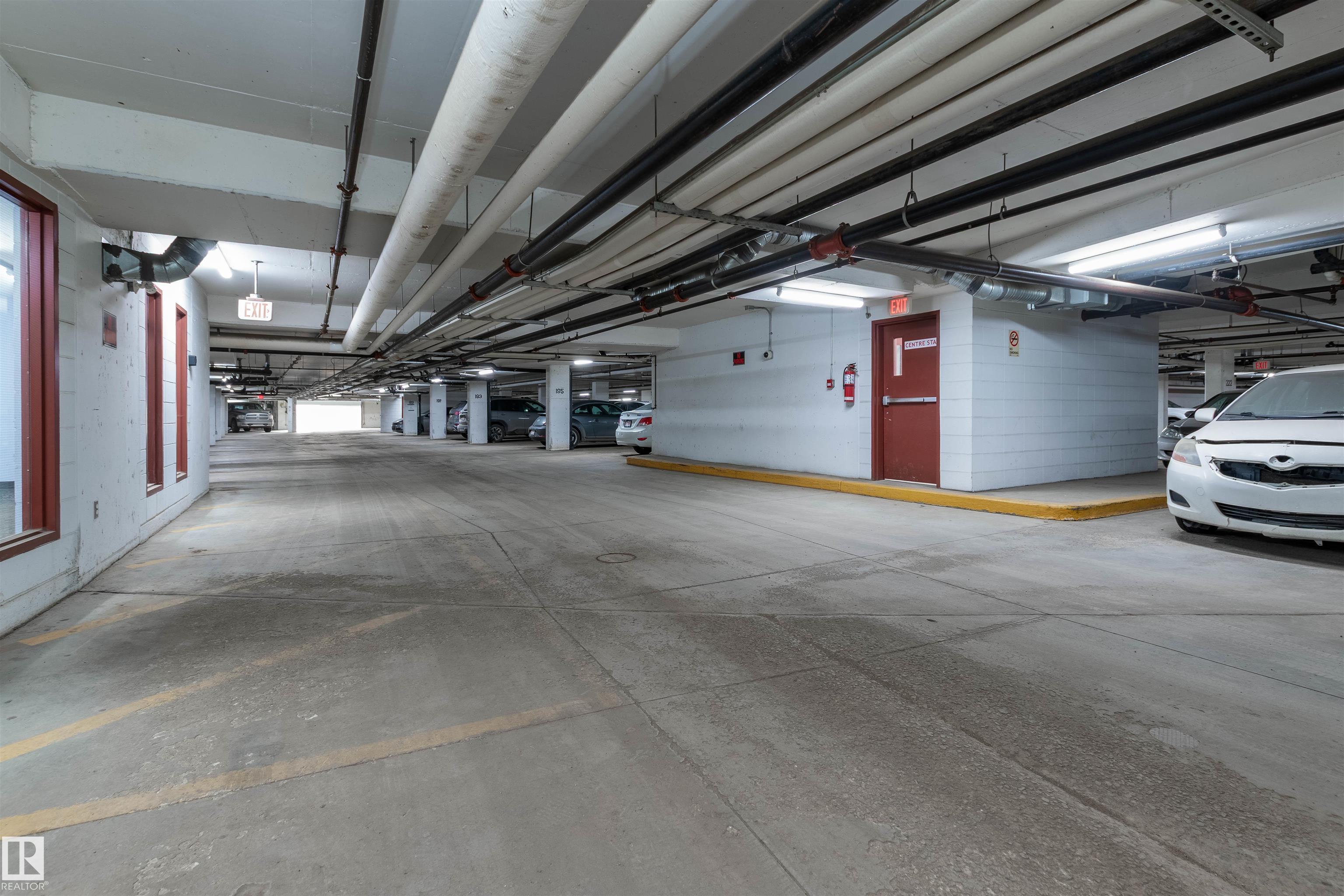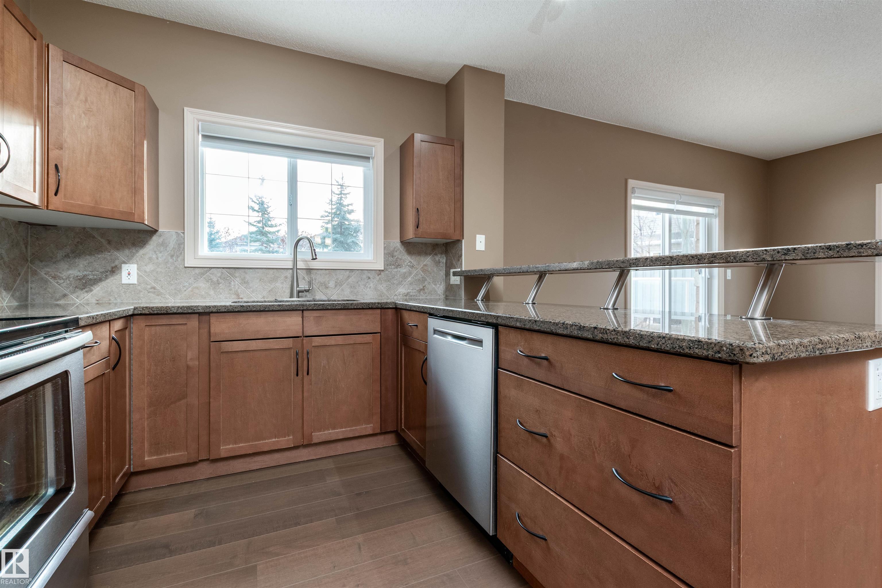 AMAZING CORNER UNIT WITH WRAPAROUND DECK FACING SUNNY PRIVATE COURTYARD! This 2 BR, 2 bath unit with 9-foot ceilings comes with TWO TITLED Parking stalls ( one underground close to elevator and 1 surface stall), plus a large storage room just down the hallway! Upgrades include NEW: paint, engineered flooring, carpet in MBR, refrigerator, kitchen tap and blinds throughout, making this property move-in ready! The chef's kitchen has large granite counters and peninsula and stainless steel appliances. There is even a storage cupboard at the spacious front entry. Primary bedroom is generous in size with walkthrough closets and full ensuite bath. The other bedroom is on the opposite side next to the other full bath. Condo fees include heat, water AND power! Social room and fitness room. Pet-friendly. Walk to the Blackmud Creek Ravine which is close by. Across from park, playground, transit and mere minutes from shopping, the Anthony Henday and Ellerslie Road. Just move in! Some photos Virtually Staged.