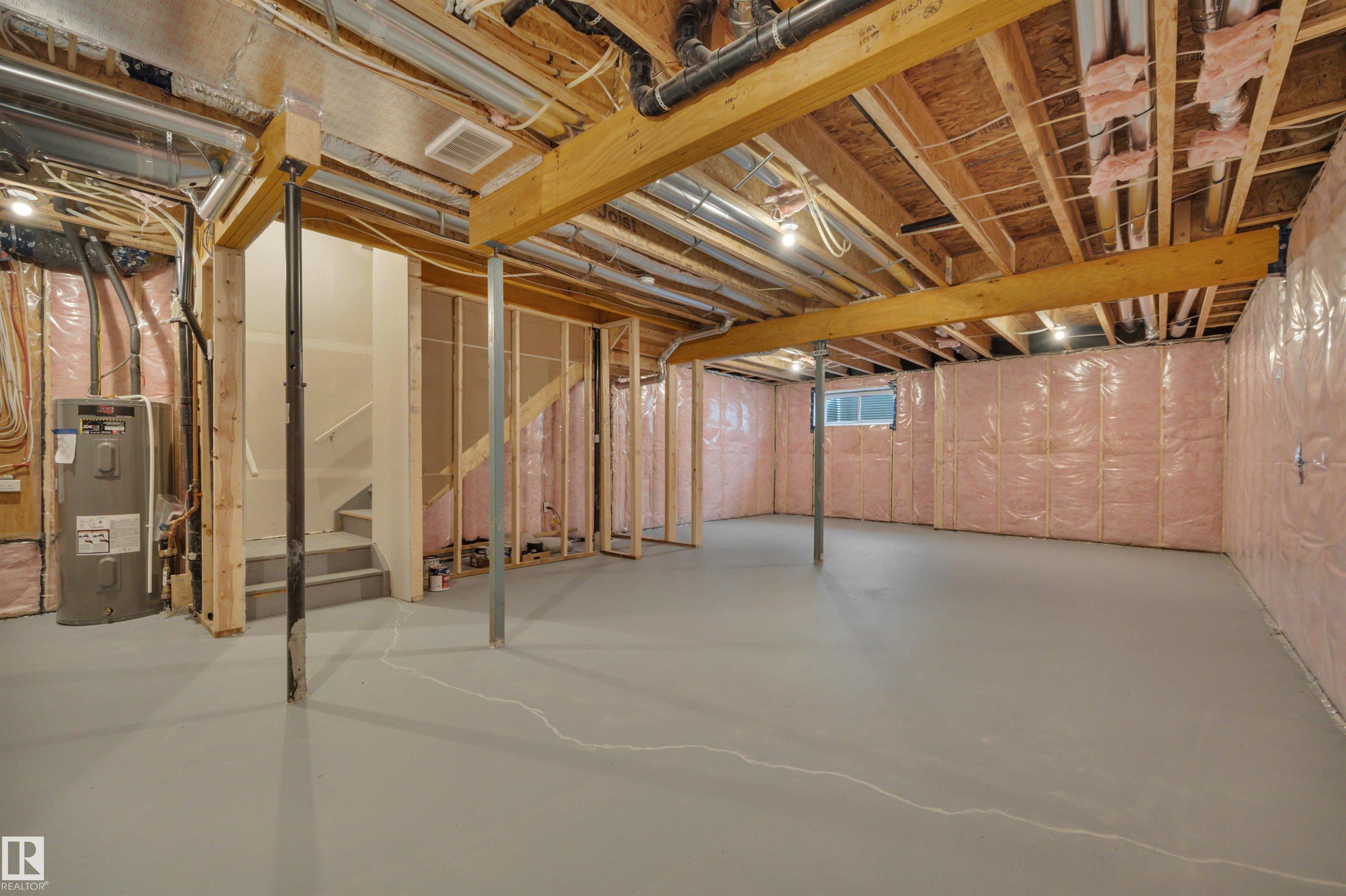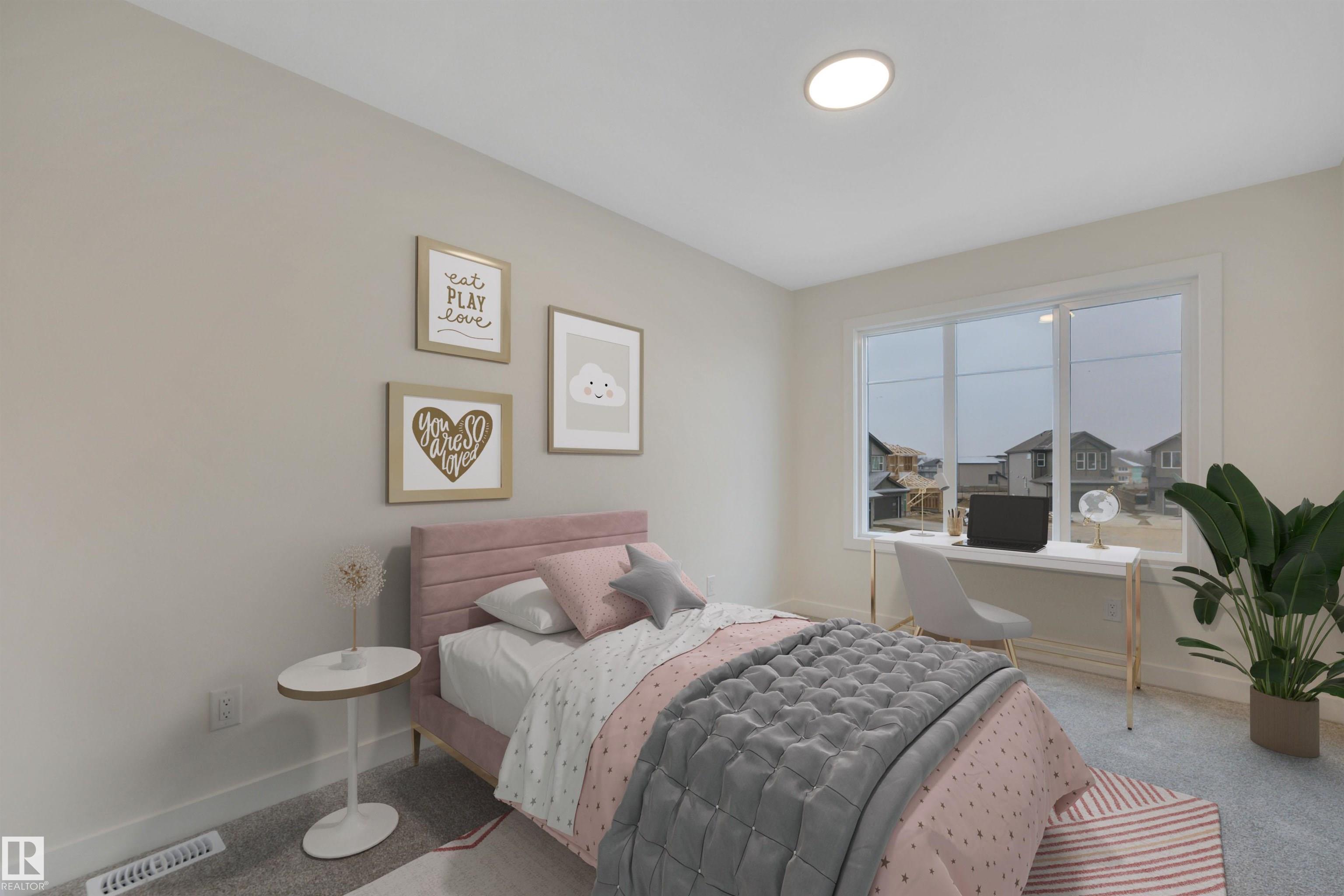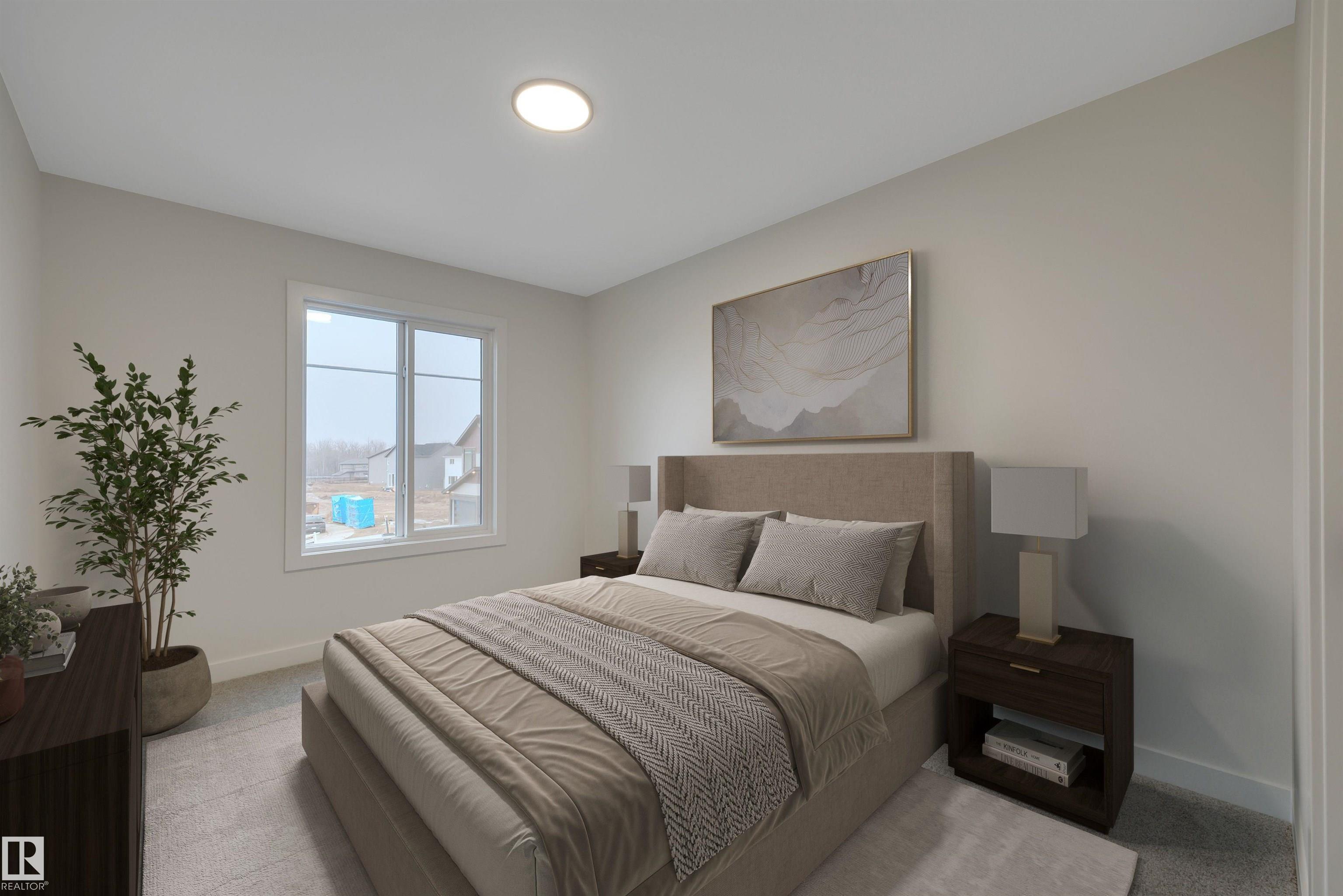 Evan model, exceptional residence crafted by San Rufo Homes, showcasing remarkable quality & meticulous detail. This home features a contemporary open layout, adorned with quartz counters, premium vinyl plank flooring & chic designer lighting throughout. Main floor welcomes you with a large & airy foyer, leading to a chef-inspired kitchen equipped with high-end cabinetry, spacious eat-up island, & convenient walkthrough pantry that connects to the garage. The dining space, complete with patio doors, seamlessly flows into the sophisticated living room, enhanced by a stylish linear fireplace, complemented by a 2-piece bath & practical mudroom. Ascend to the upper level, where vaulted ceilings create an expansive atmosphere, housing a fantastic bonus room, family bathroom, & three bedrooms, including a primary suite with an expansive walk-in closet & luxurious ensuite featuring dual sinks, tub, & glass shower. Upstairs also has handy laundry room. Backing Lewis Farms Rec Center gives privacy & quick access!