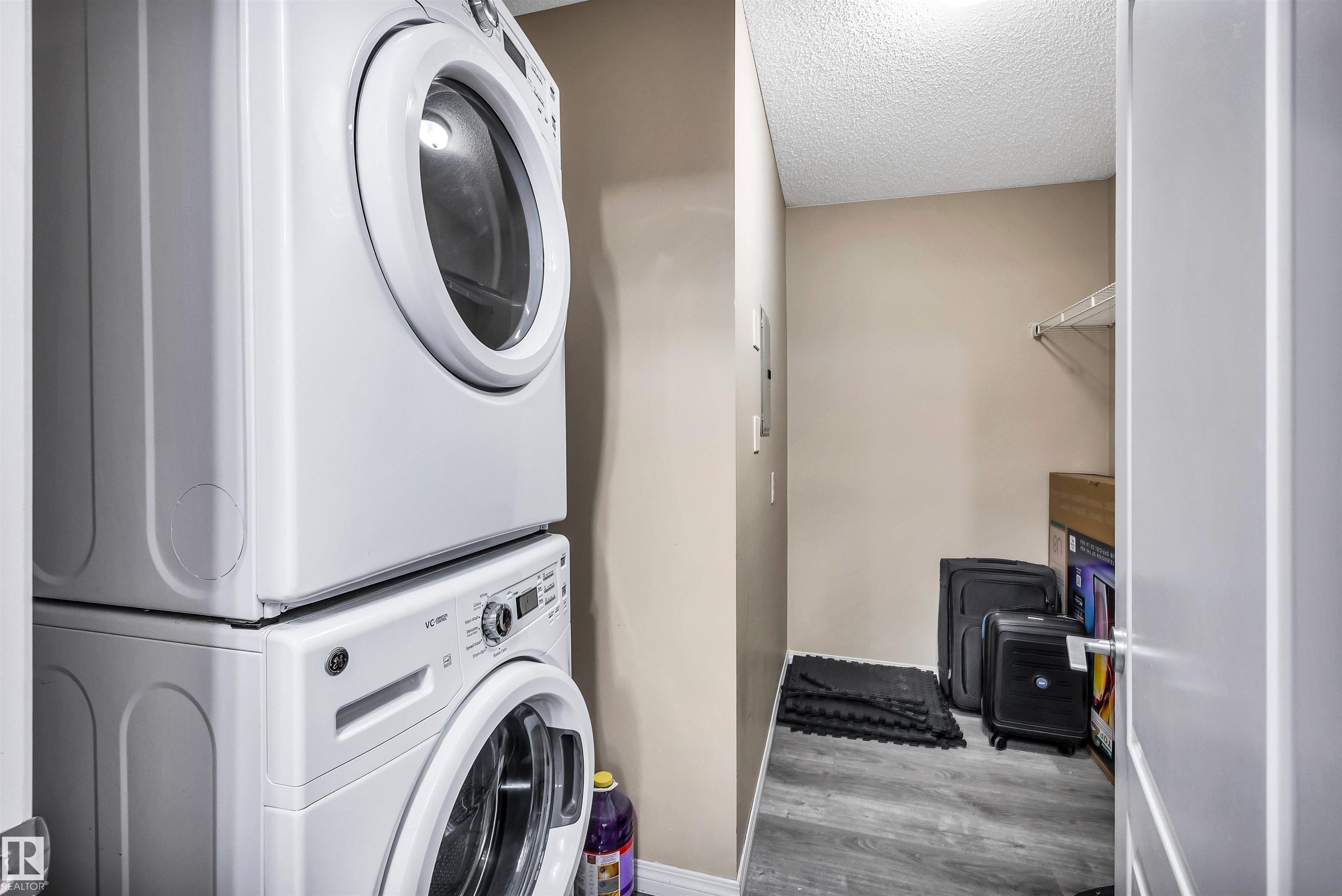 Immaculate top-floor 2 bed, 2 bath condo with stylish vinyl plank flooring throughout and a beautifully upgraded kitchen featuring stainless steel appliances, quartz countertops, and an oversized island. Enjoy the convenience of in-suite laundry within a full storage room, and a covered balcony with open views toward Rabbit Hill Shopping Centre. Just steps to transit, Freson Bros, Shoppers Drugmart, banks, schools, restaurants, park--and only 2 minutes to the Henday. Located in the newer building within the complex and complete with heated underground titled parking, this home is the perfect move-in-ready package!